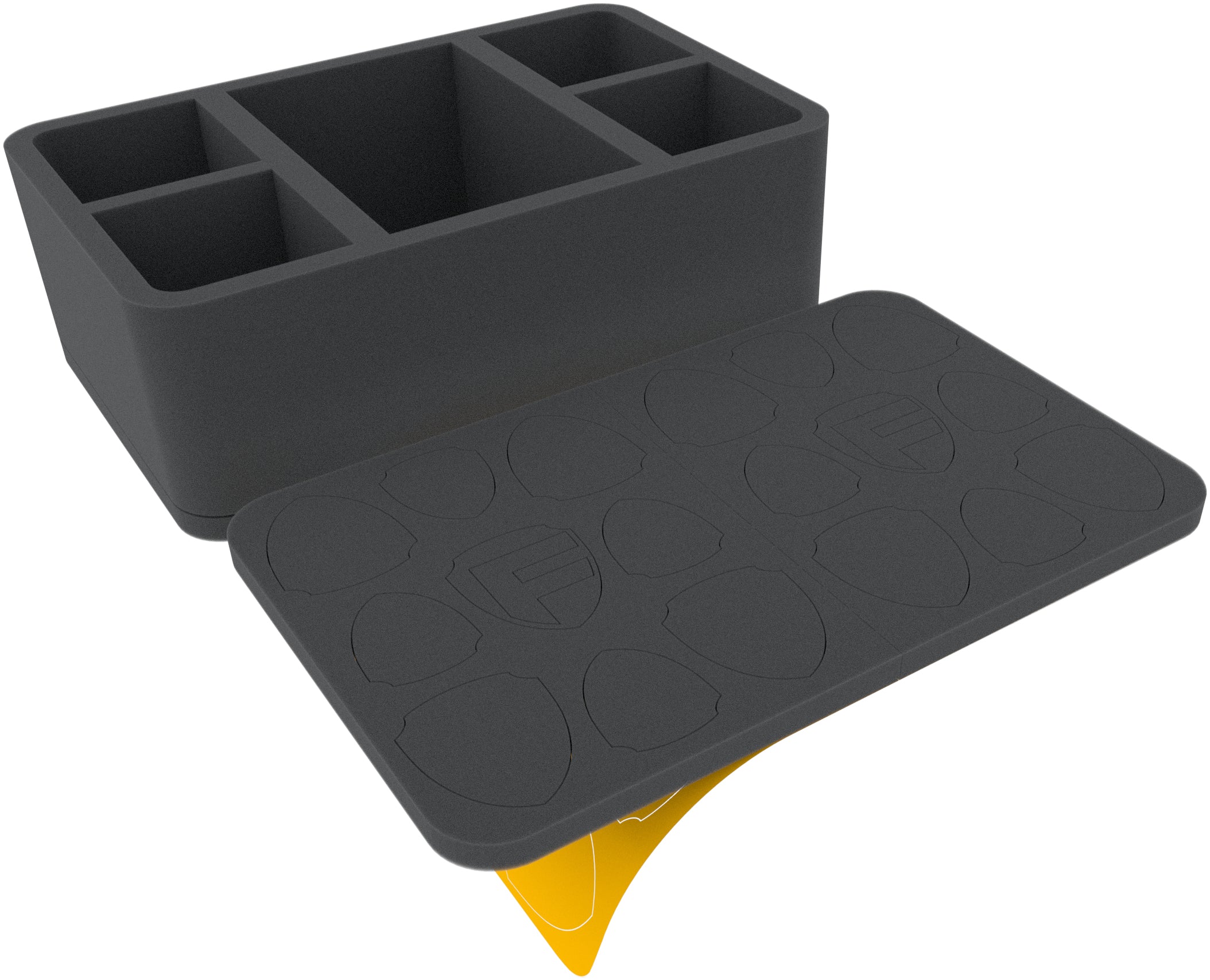 The foam set consists of a Half-Size foam tray with five compartments and a Half-sized insert with 18 perforated spacers and a self-adhesive underside. Peel off the foil and attach the supporters to the desired location. You can glue multiple supporters on top of each other.