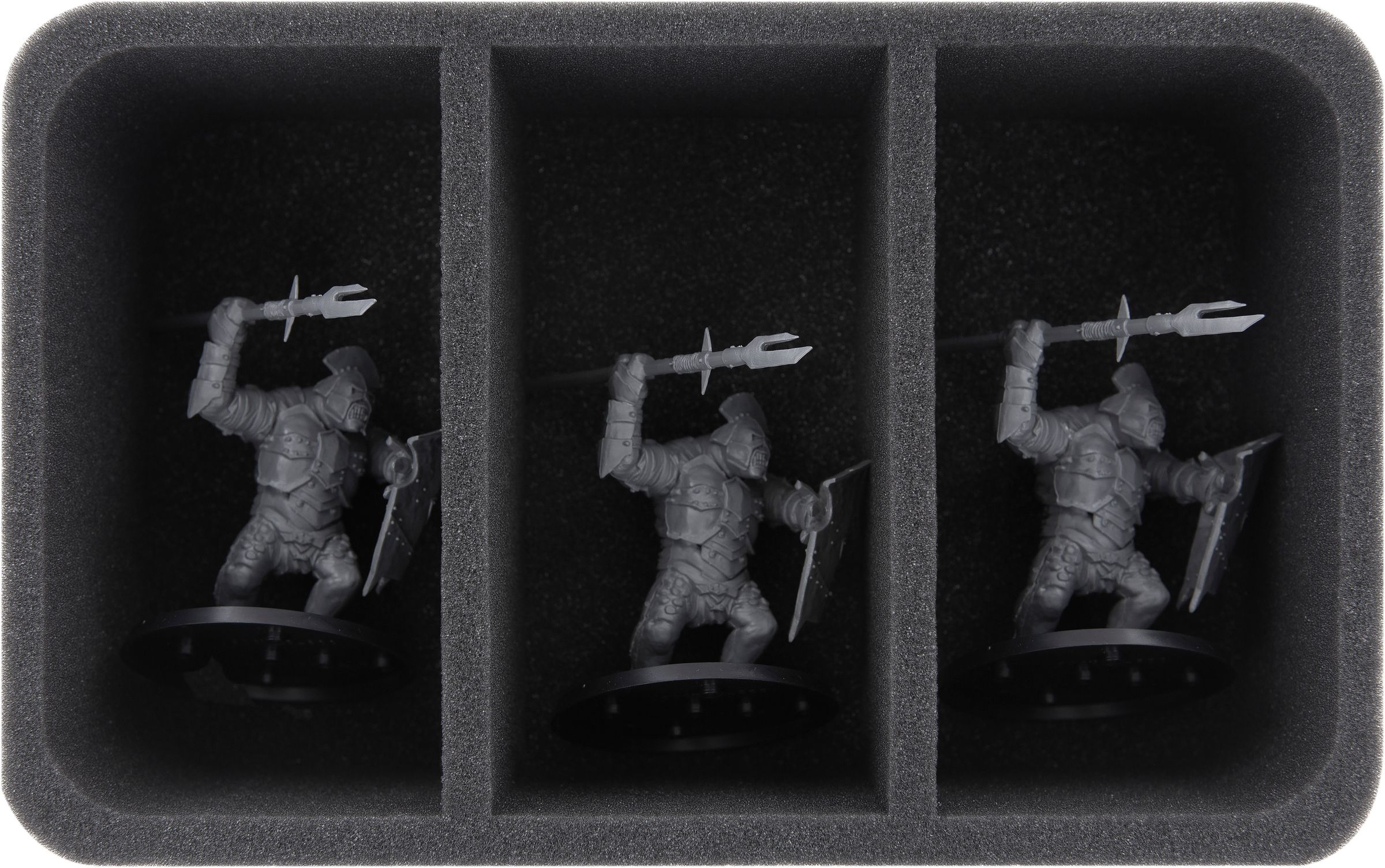 - The third insert with 2 round base-sized compartments provides a secure stand for the large figures and 34 compartments for warrior, rider and orc models.