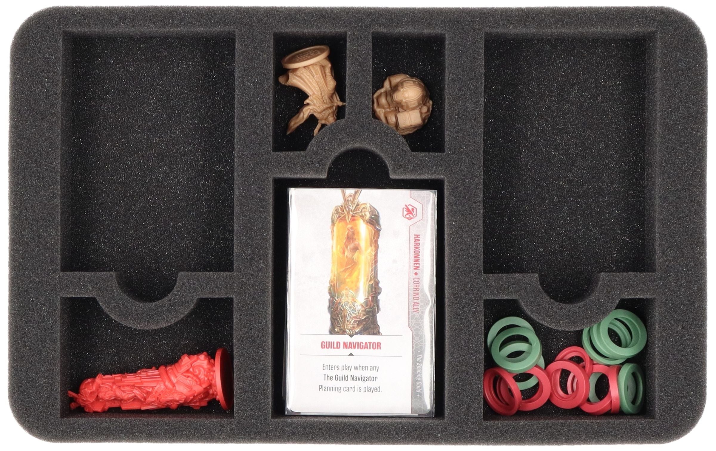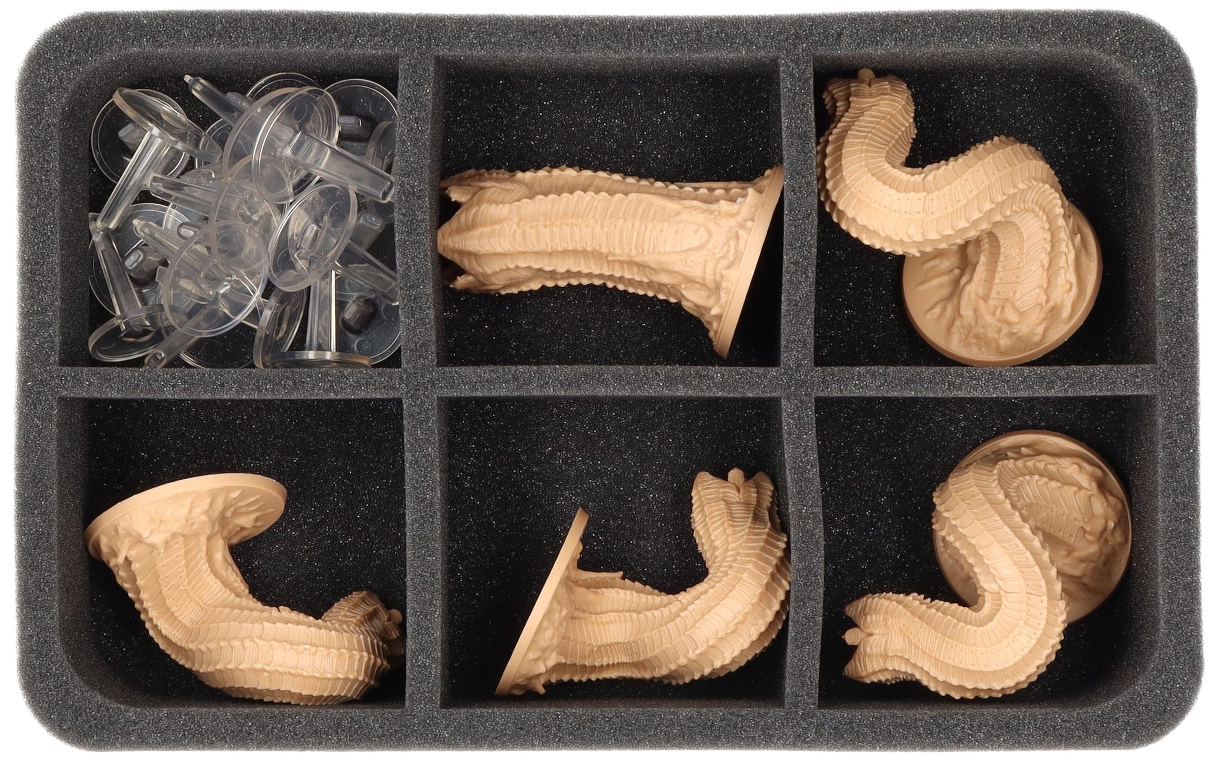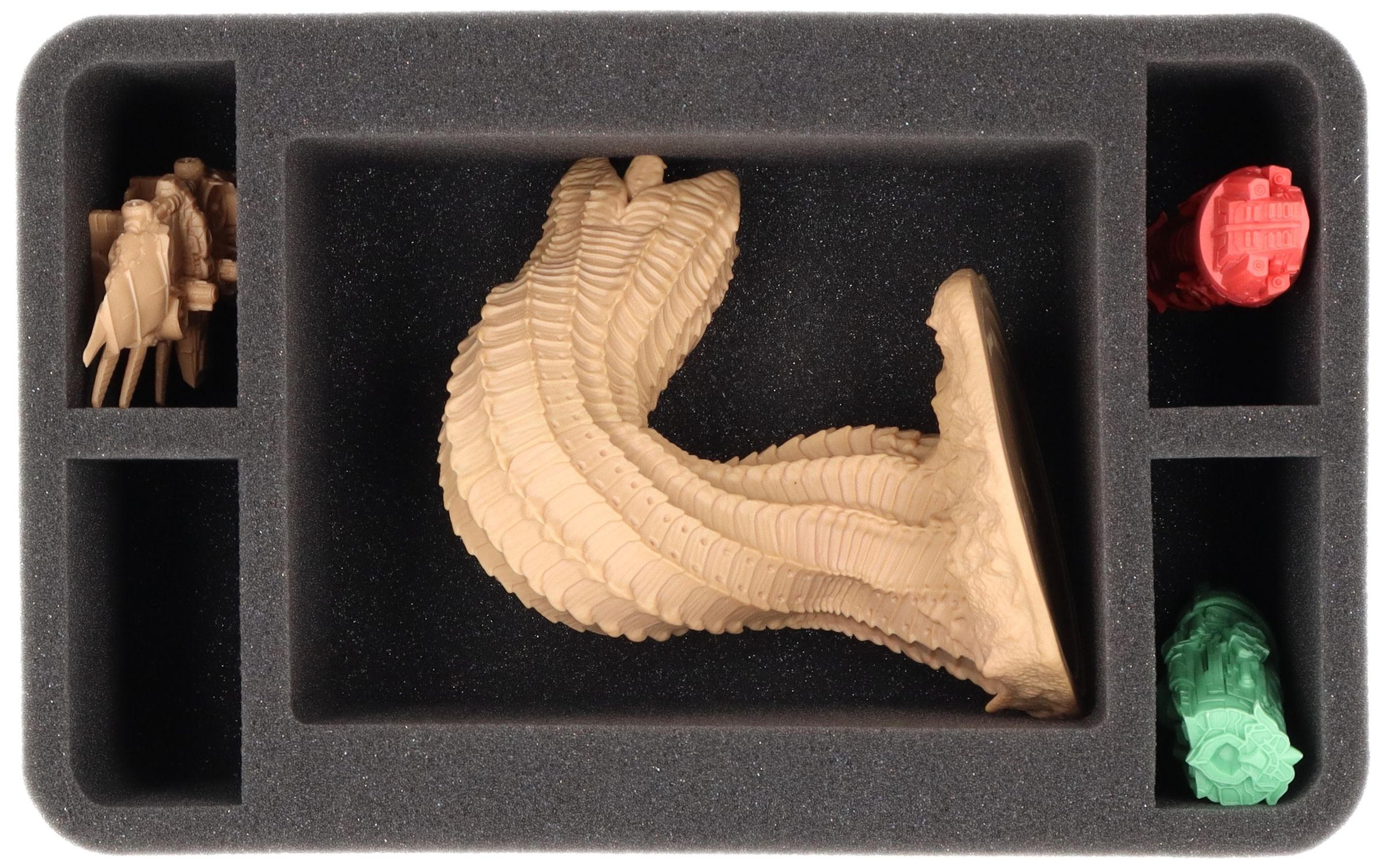 - 1 Half-Size foam tray with 5 compartments for the large sandworm + miniatures from the expansions (HSMEVE105BO)