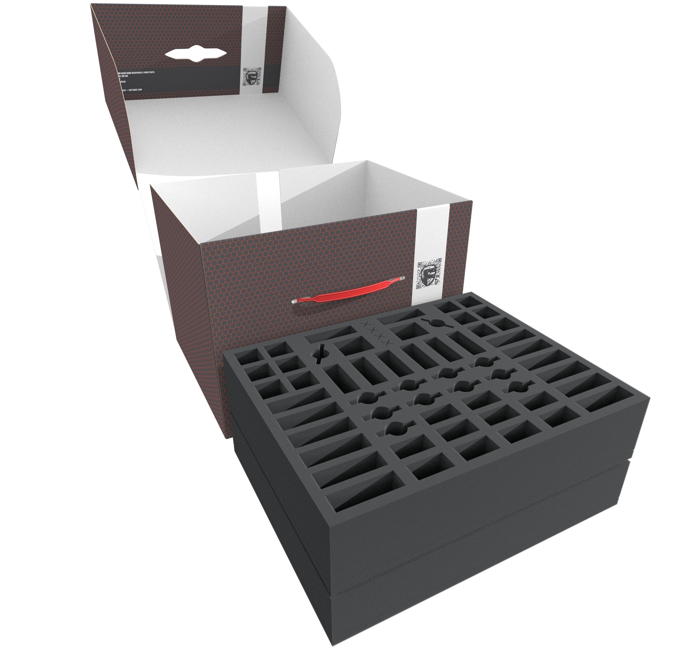 The Storage Box FSLB250 is made of coated, double-walled cardboard. This makes it not only pleasantly light, but also particularly tear-resistant and stable. With the matching foam trays, miniatures and game material can be stored safely and dust-protected and can also be transported effortlessly with the plastic carrying handle.
