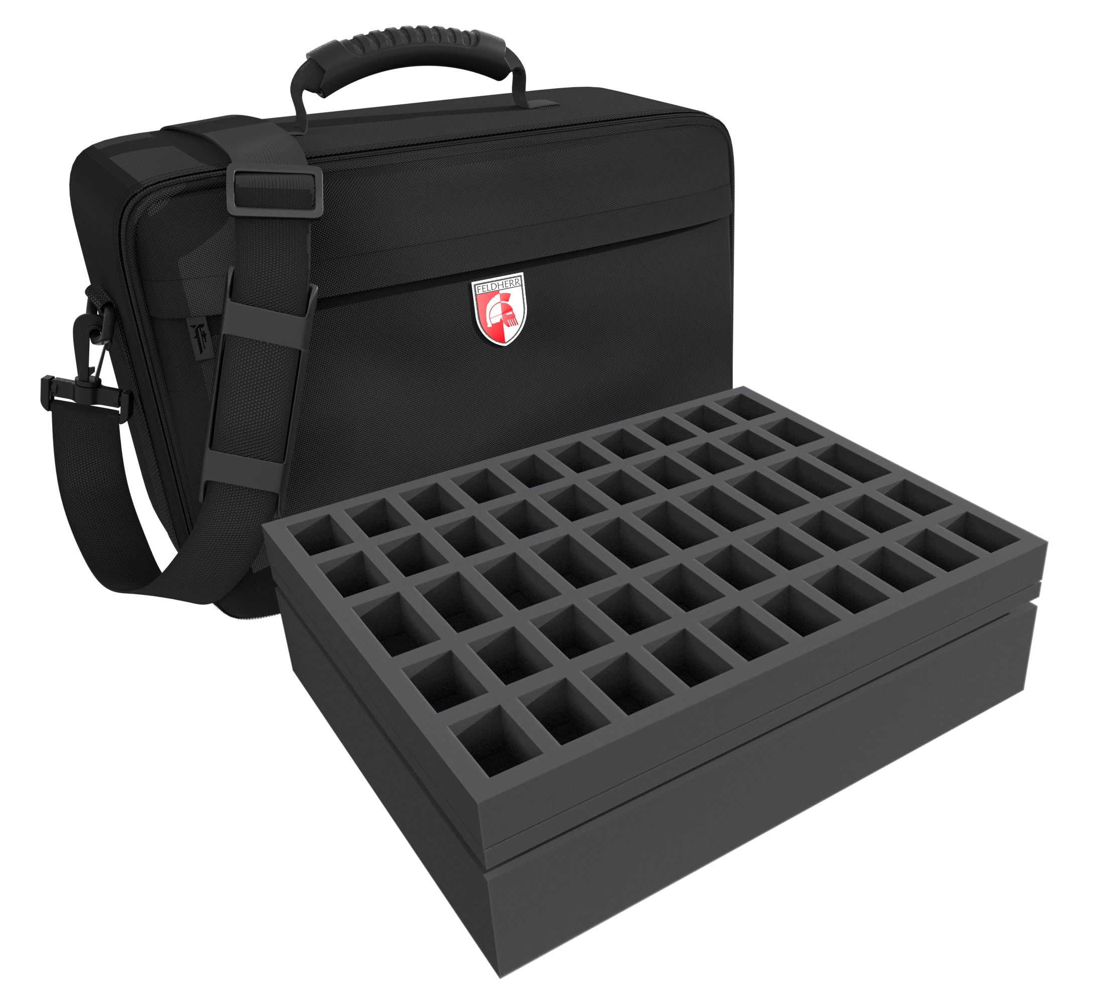 If you are looking to safely store and conveniently transport your miniatures collection to your friends, look no further. The Feldherr MEDIUM PLUS bag for 100 miniatures and tanks/monsers is jam-packed with high-quality foam for your models. The fine-pored foam provides reliable protection against damage – fragile parts stay intact, the color of painted models remains unharmed.