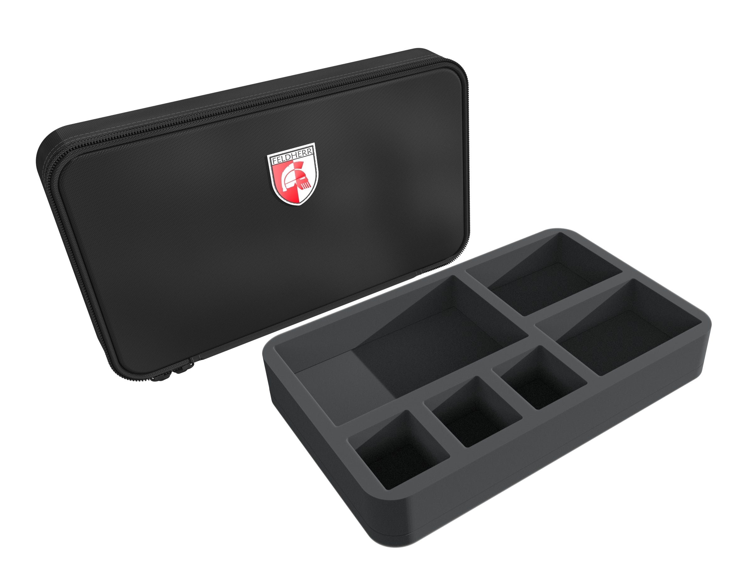 To orderly store and safely transport your game materials, Feldherr offers you this MINI MINUS bag with the matching foam tray for all cards, tokens, constructs (unassembled), artifact items and dice of the "Tiny Epic: Defenders - The Dark War“ box by Gamelyn Games.