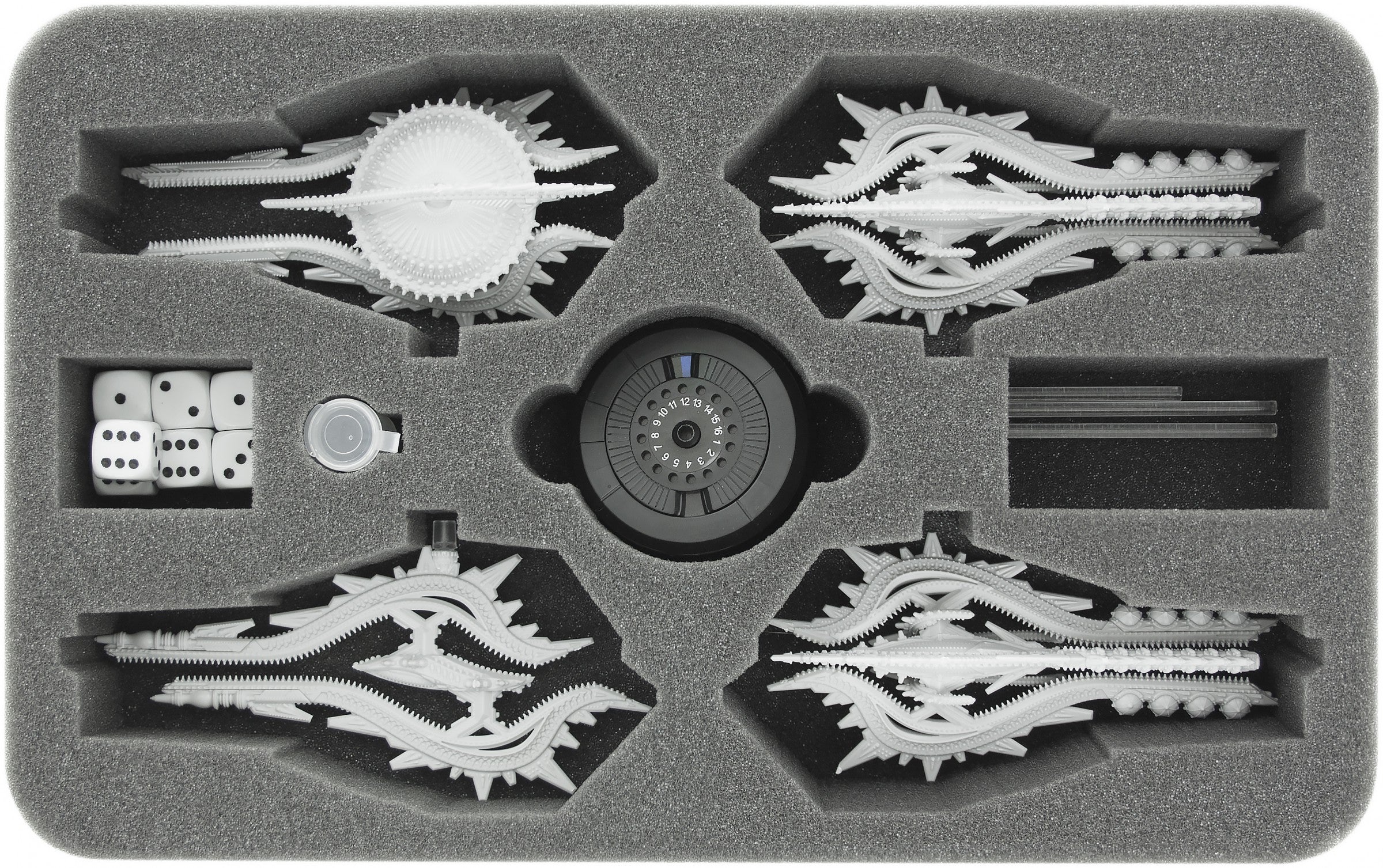 Feldherr MINI PLUS case for Feldherr MINI PLUS Case for Dropfleet Commander: Shaltari. The bag fits 8 Cruisers and up to 22 Voidgates. In addition, small plastic capsules are included for the damage pegs.