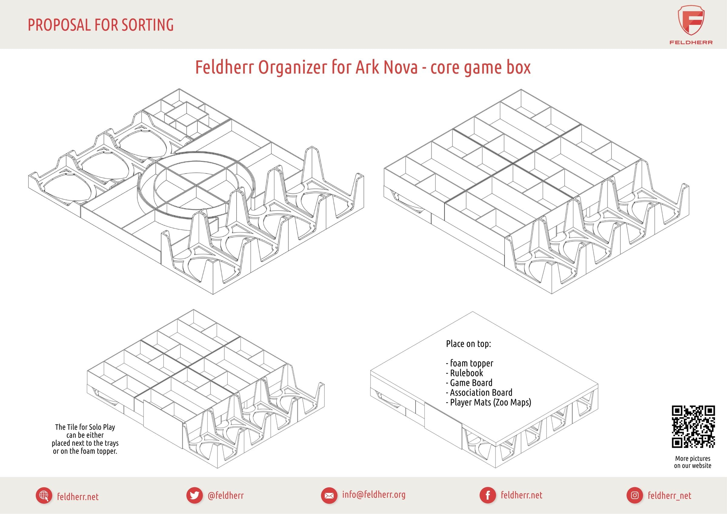 - You can store the rules booklet, the icon overview, the glossary, the game board, the association board and the player boards (zoo maps) on the foam topper. Hide the tile for solo play on the edge of the box next to the token holders.