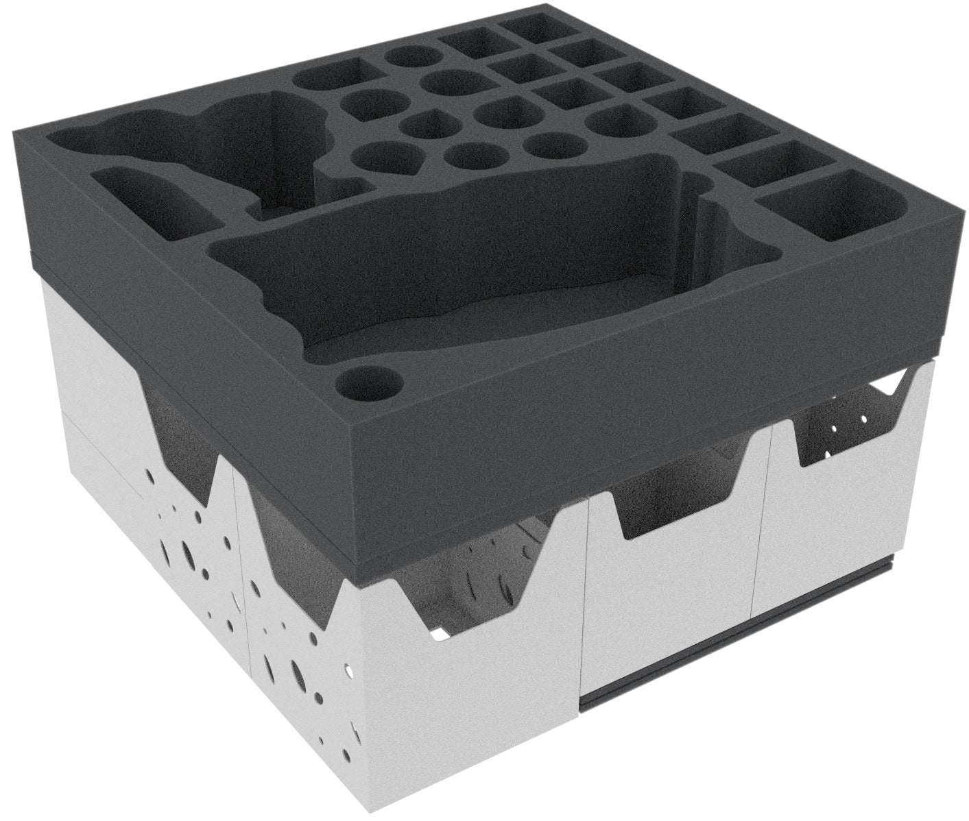 A thick foam mat improves stability and prevents the card holders from slipping. Three thin foam mats are used as height compensation inside the core game box.. Place the foam toppers on the foam trays. They ensure that none of your precious models will bump against the lids of the board game boxes during transport.
