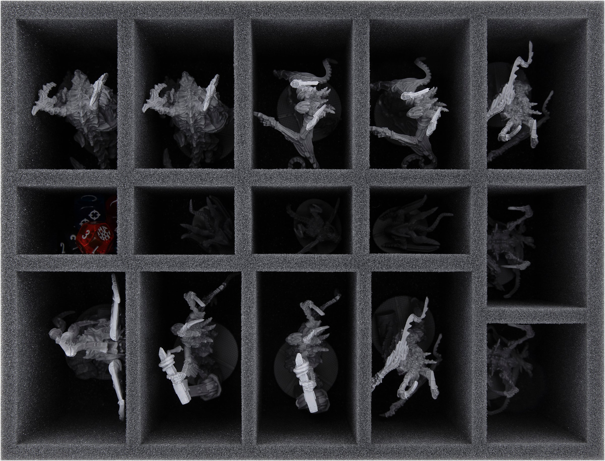 - 1 foam tray with 6 compartments + plastic figure holders for small alien miniatures like Larvae.