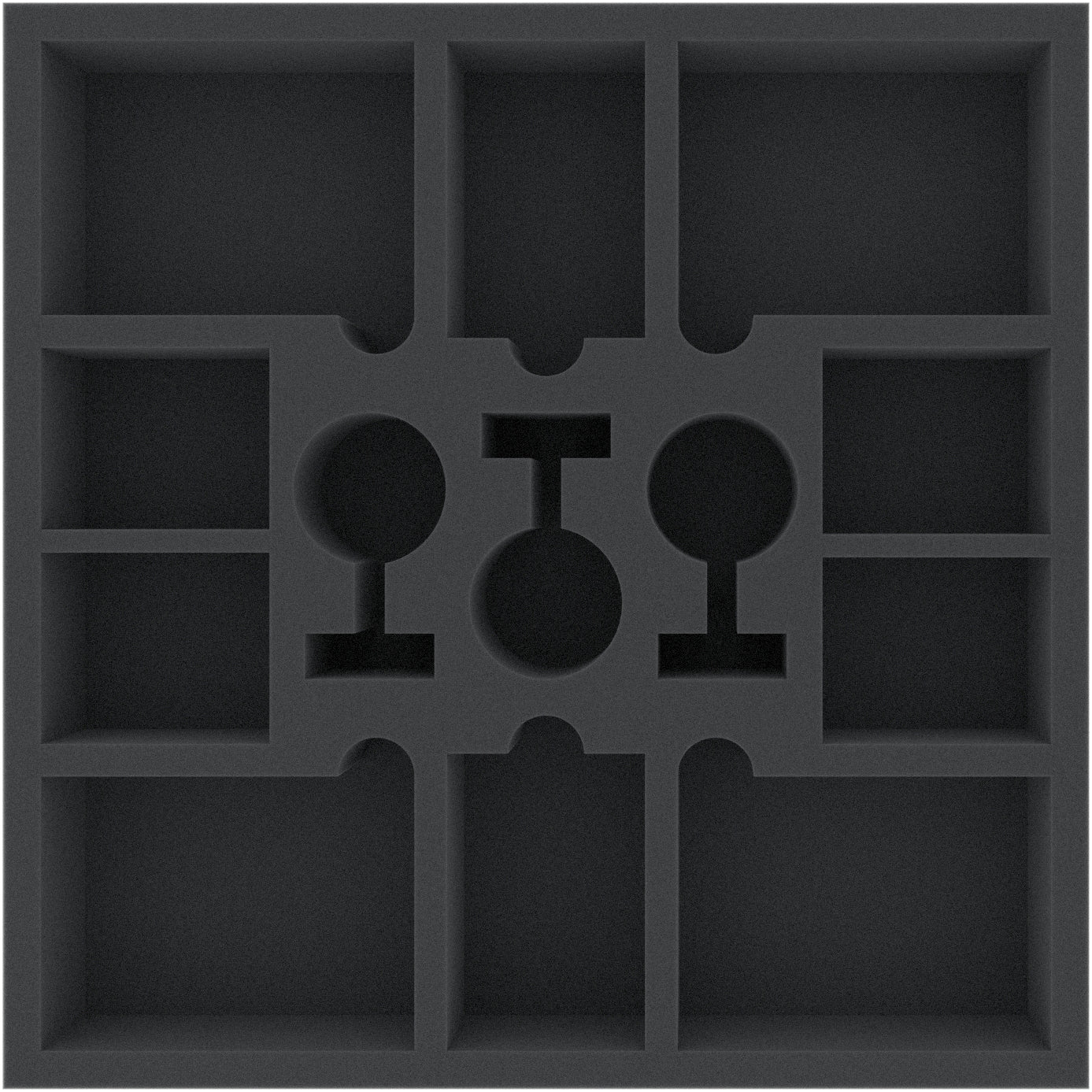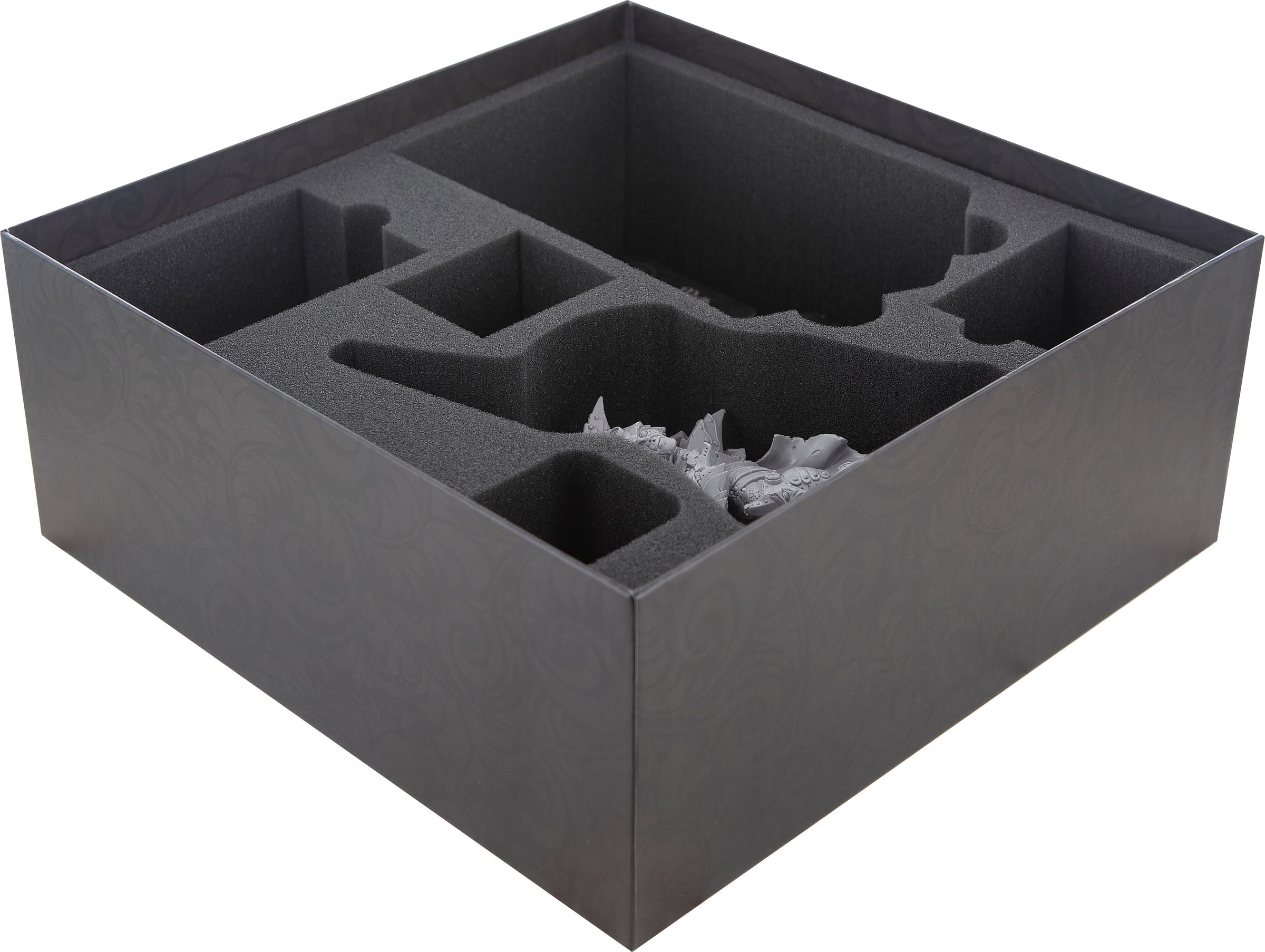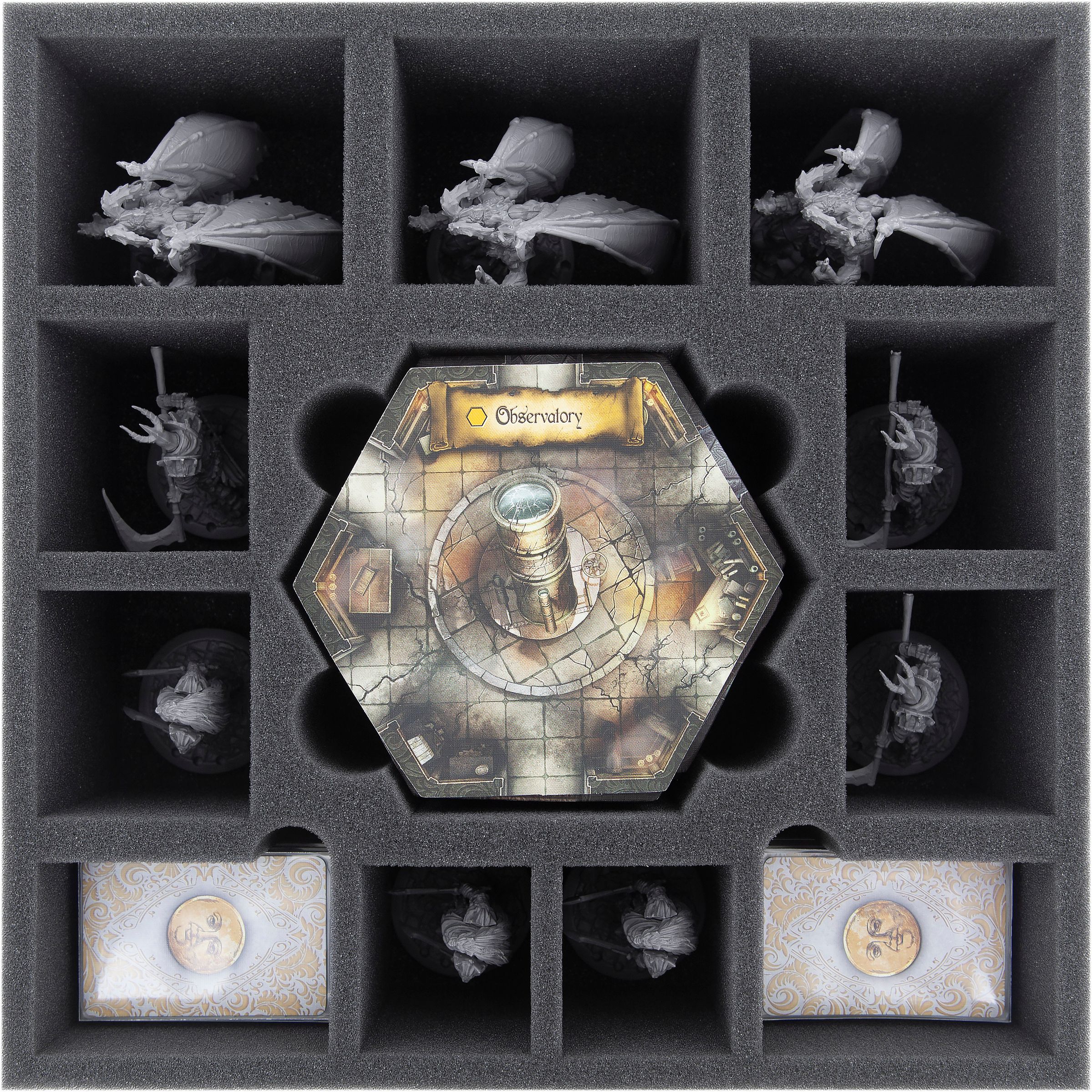 The large Evocations of the core game can be accommodated in the upper 85 mm high foam tray. The three Malacoda, as well as the Cerbero and the Bone Knights, are assigned their own custom-fit compartments. This ensures that the fine detailed miniatures remain safely in place even during transport.