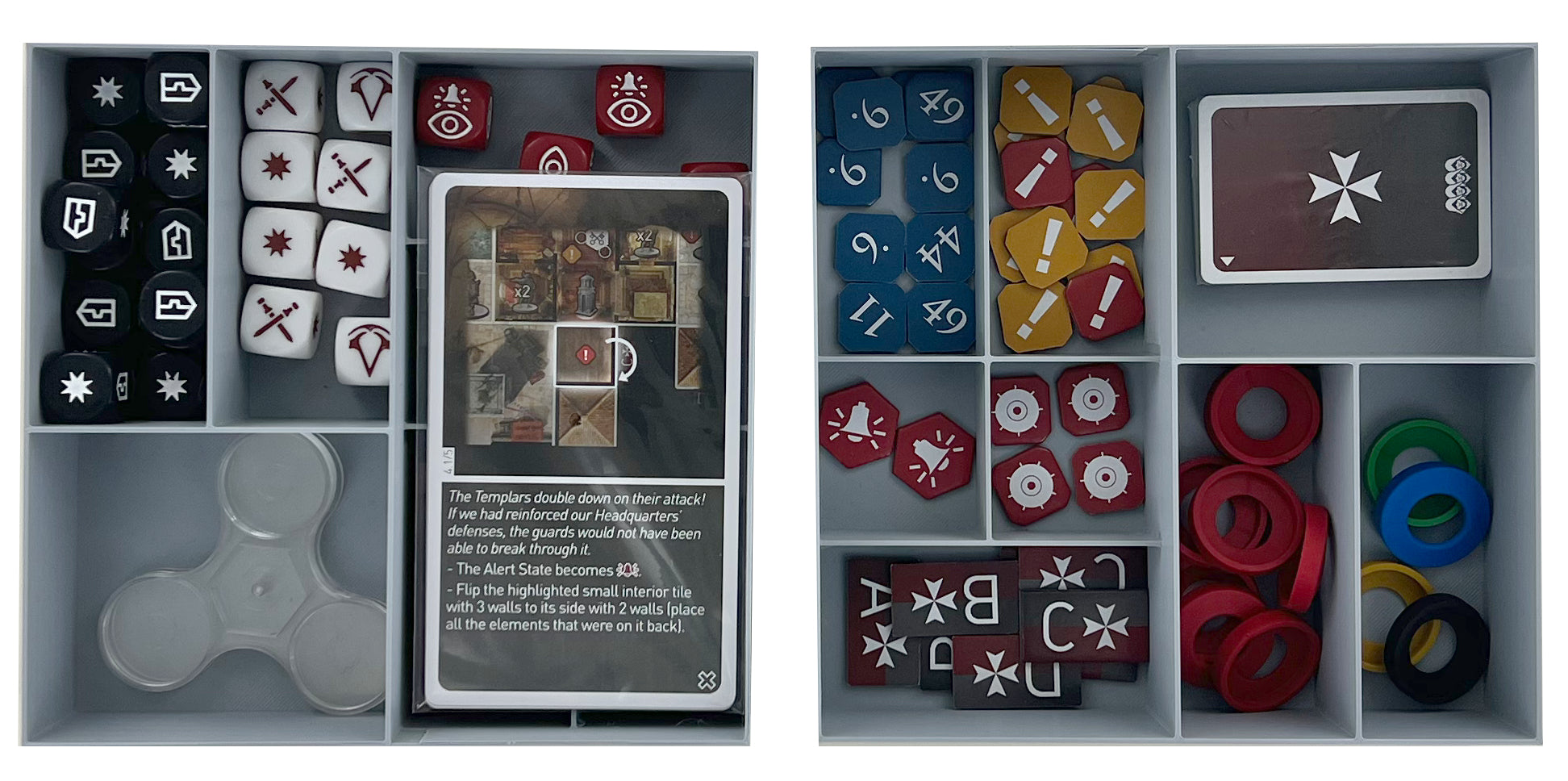 • Two-Sided Templars Board, Assassin/Apprentice Boards, Tiles, Mercenaries Headquarters Board & Event Deck, Courtesans Headquarters Board & Event Deck, Campaign & Rules Booklets and unlocked Stretch Goals are stored on the supplied foam topper.