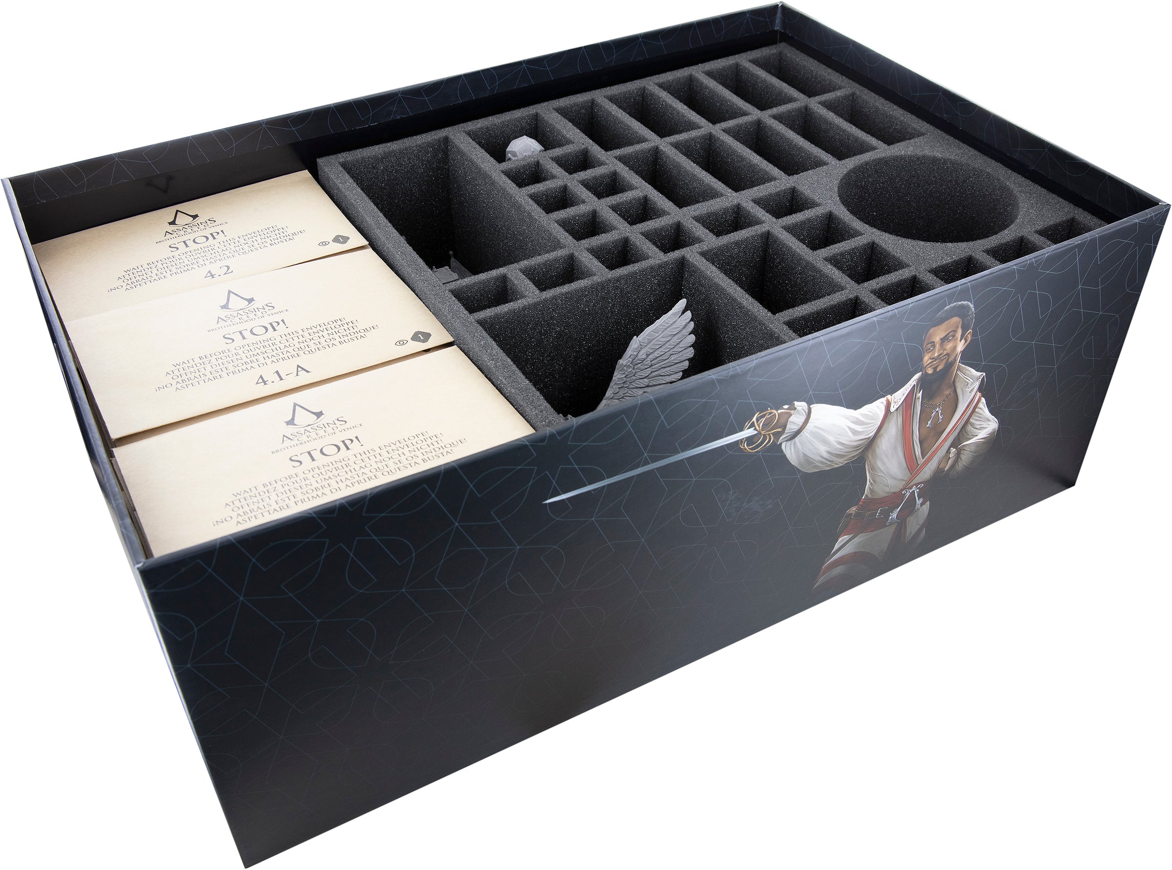 The Assassin's Creed has gotten into your blood. You've been waiting for a long time for the hit video game to be adapted into a board game. Now the time has finally come, and you have been able to purchase all the unlocked Stretch Goals from the Kickstarter campaign in addition to the core game. To ensure you never lose sight of your target with the number of figures and all the game material, we have designed a matching set for the original core game box. In the foam insert, you transport your figures without broken blades and details to the next mission and arrange your game material clearly and neatly in the plastic trays.
