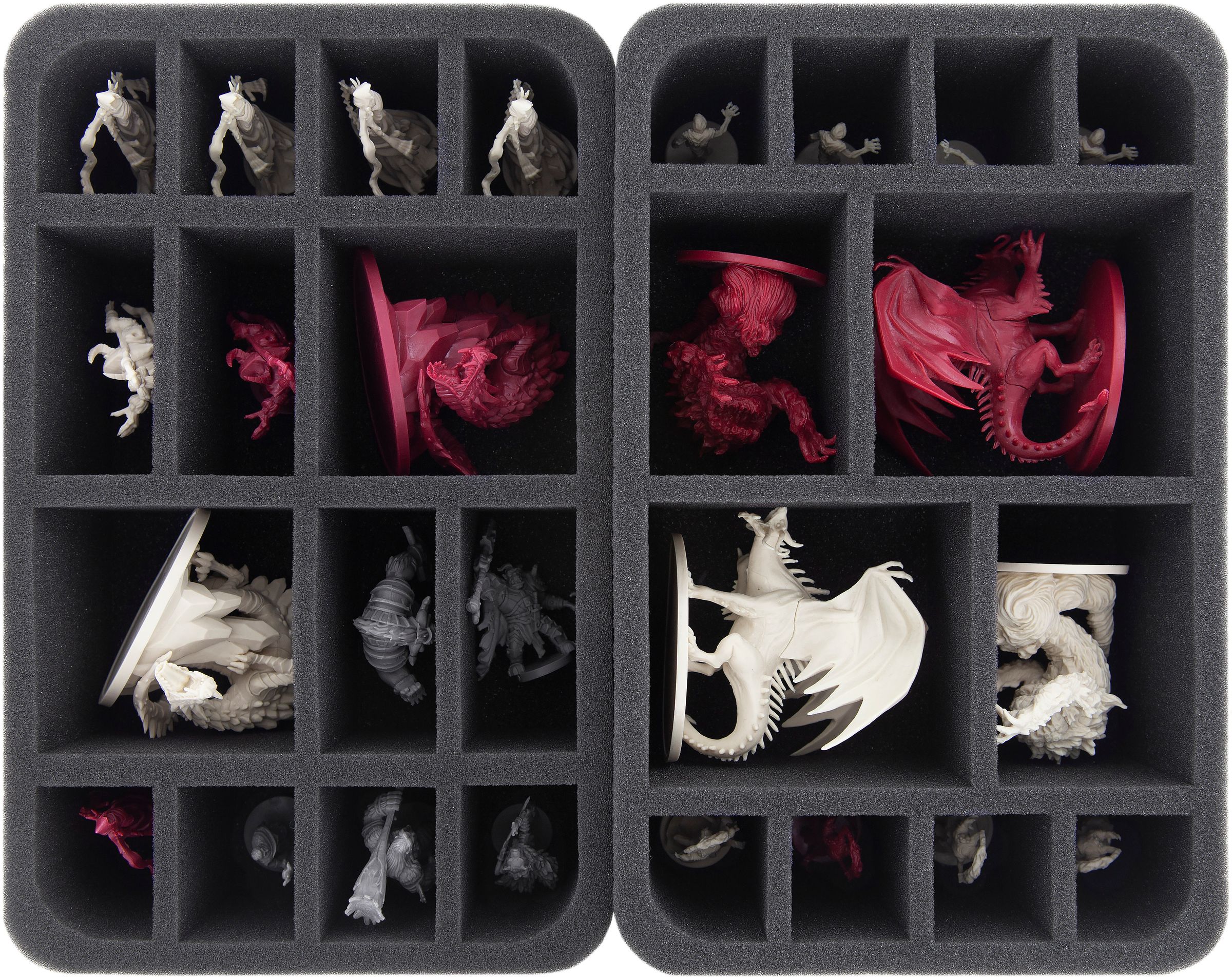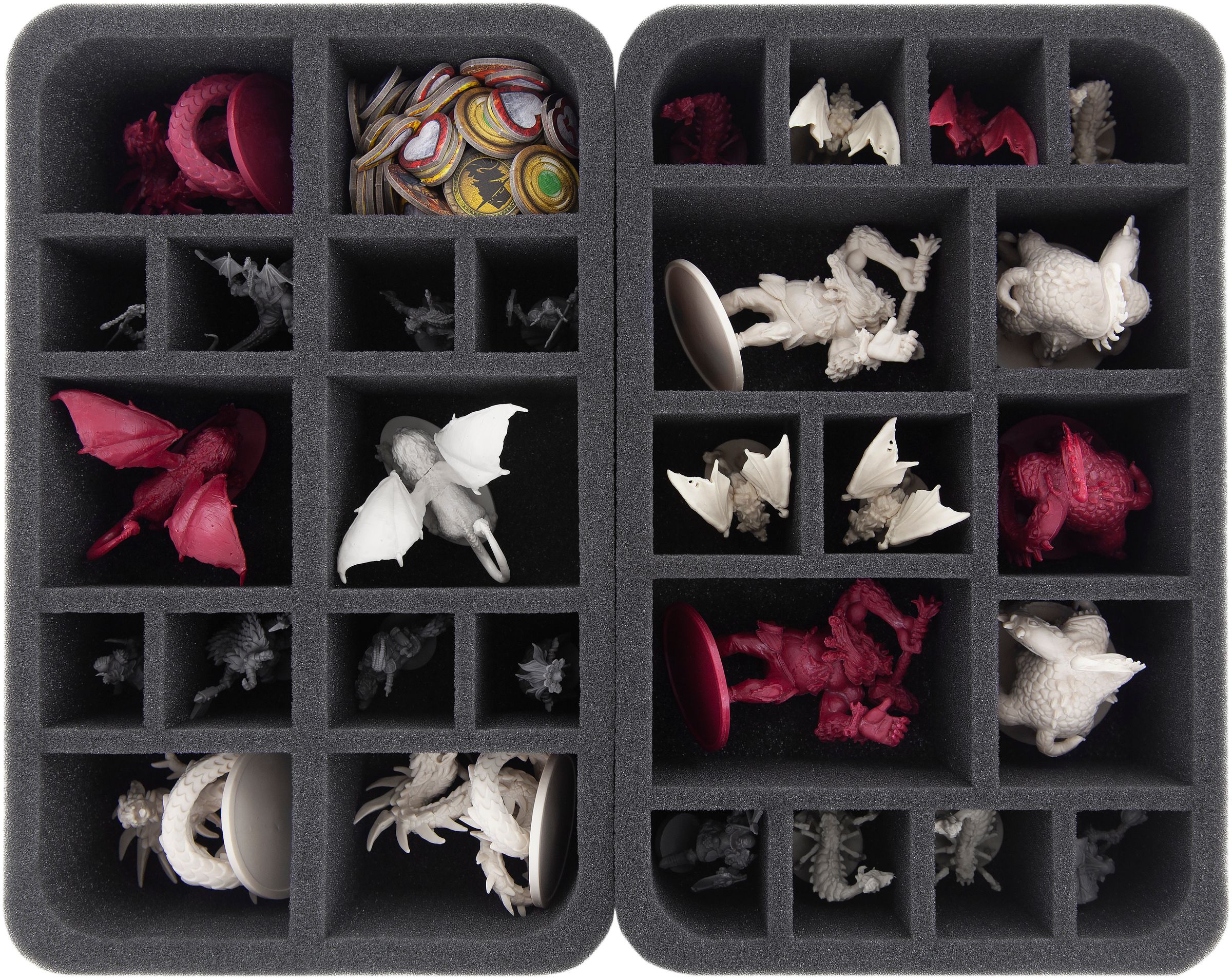 10 custom-fit foam trays ensure that all your hero and monster miniatures are padded softly. From the Shadow Dragons to the Harpies to the Cave Spiders, there is a suitable compartment for every miniature.