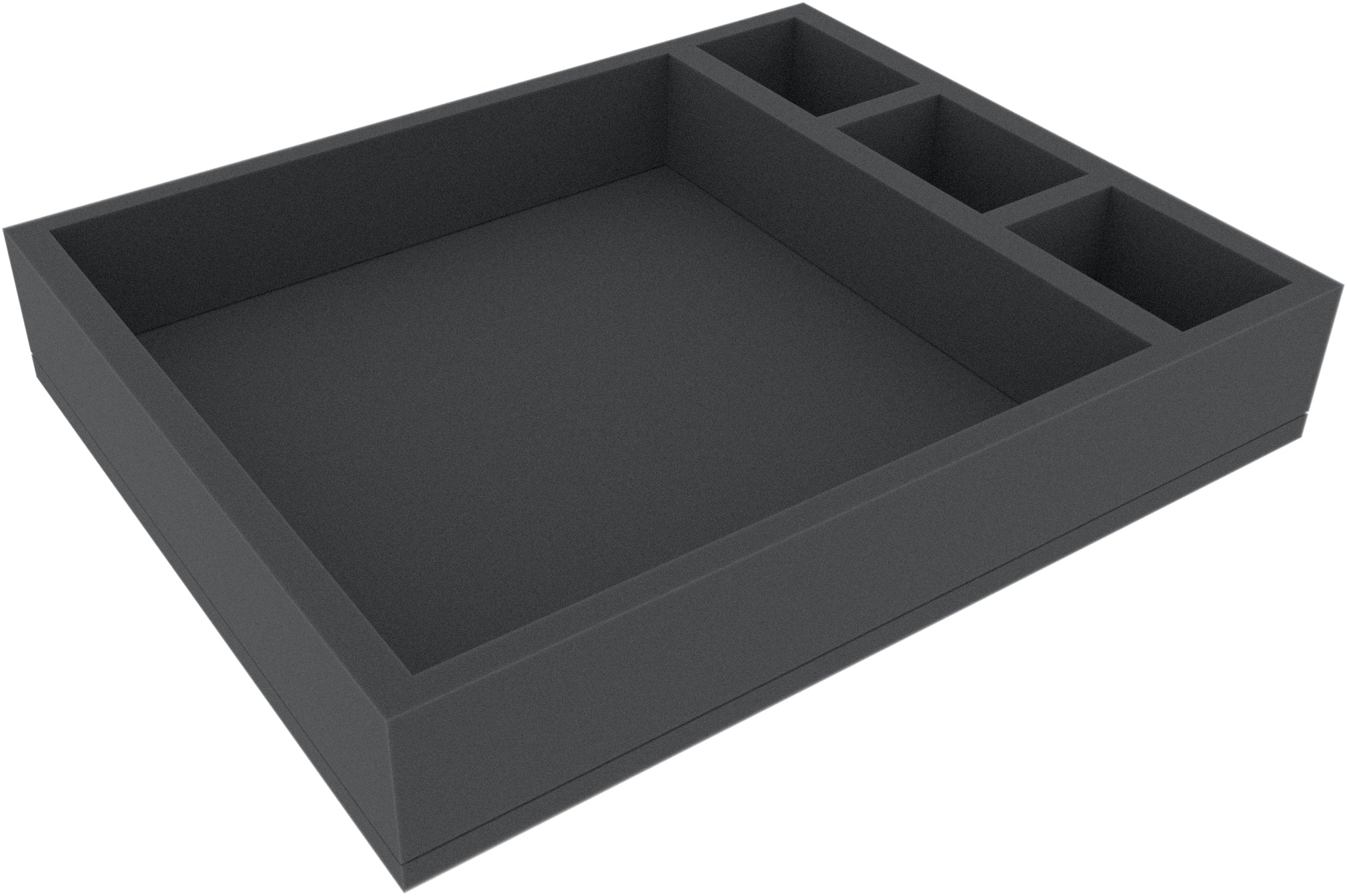 This Full-Size foam tray is divided into 4 compartments, one large square and three smaller rectangular next to it. It is particularly suitable for clear storage of tiles, tokens, cards and other game materials.