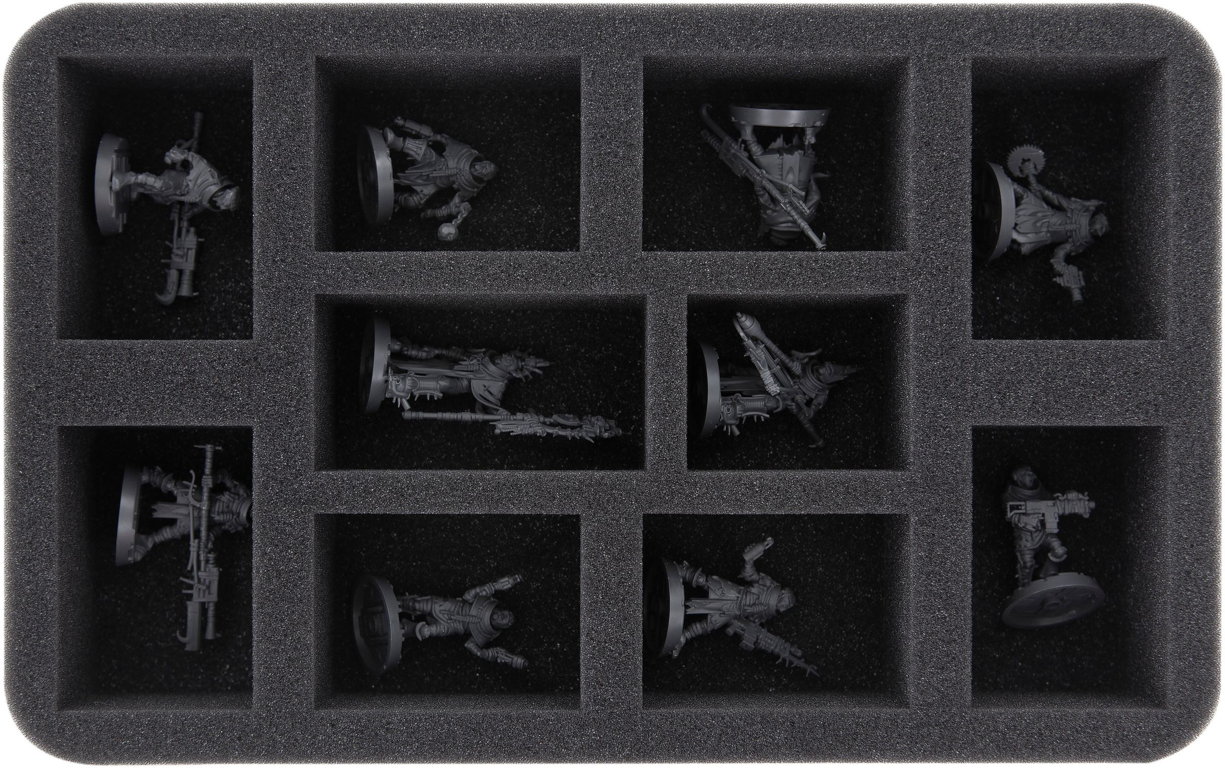 On this Feldherr foam tray you have space for up to 10 miniatures. With this you have enough room to protect at least one Necromunda gang during transport to the tabletop. The insert is especially suitable for storing the Escher, Goliath, Slave Ogryn Gang, and models with similar dimensions.