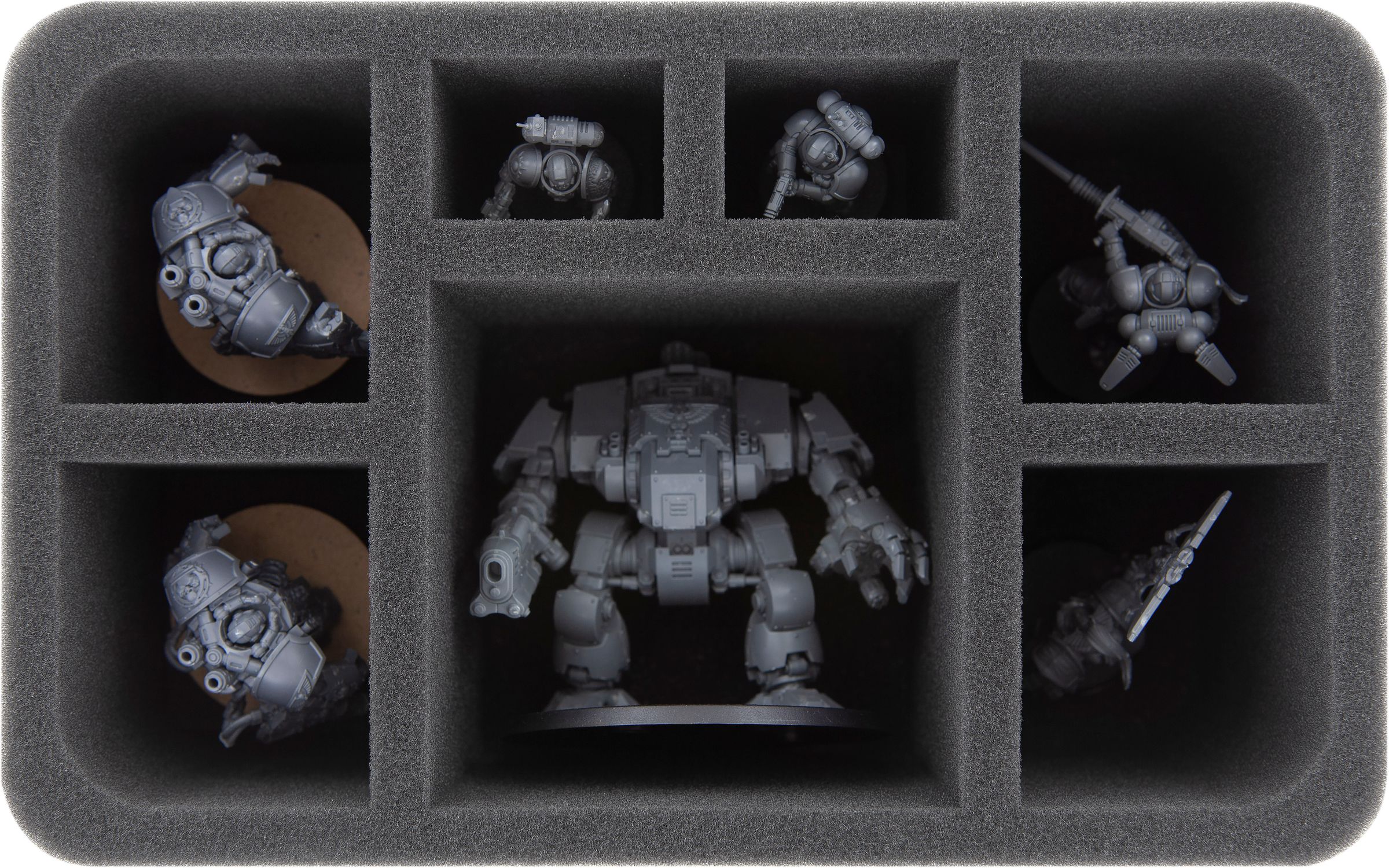 This Feldherr foam tray is divided into 7 compartments of different sizes. One Redemptor Dreadnought of the Deathwatch fits into the large compartment in the middle. The precisely fitting cut ensures that the miniature remains securely in place during transport. Hereby, the soft foam not only protects the weapons from damage, the colors of the painted model are also spared from abrasion and scratches.