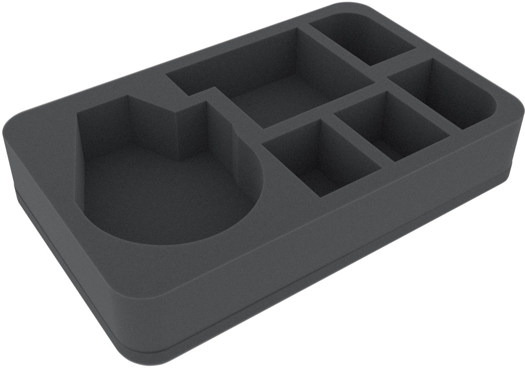 This 50 mm high foam tray is divided into 6 compartments. It is particularly suitable for the safe storage of tabletop and board game miniatures, as well as other fragile models and small parts.