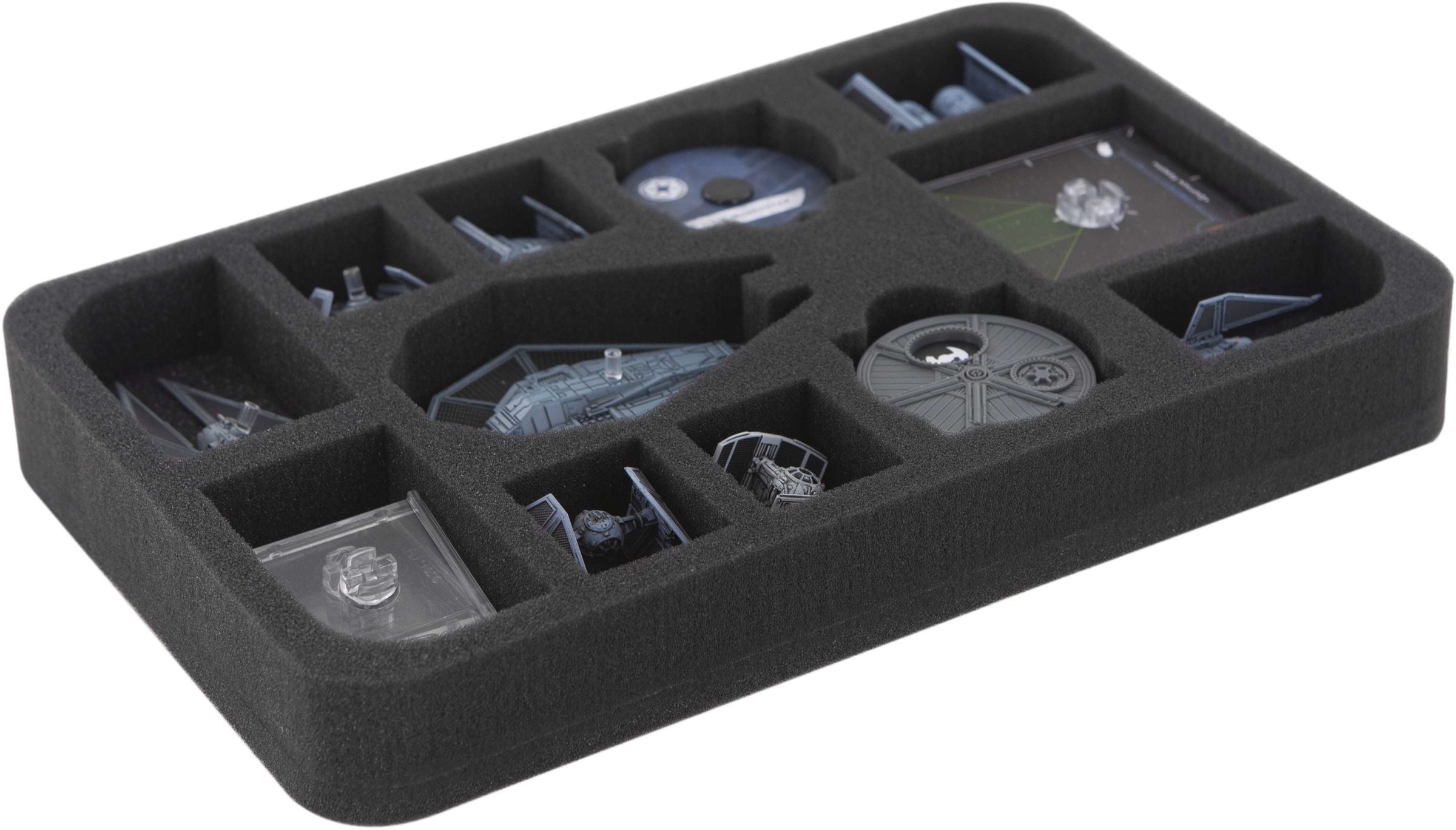 For the other game components, such as cards und tokens, we recommend the suitable foam tray for Star Wars X-WING dials, token and accessories (HS045XW01).