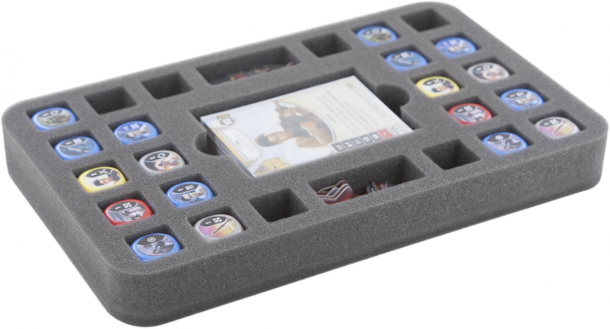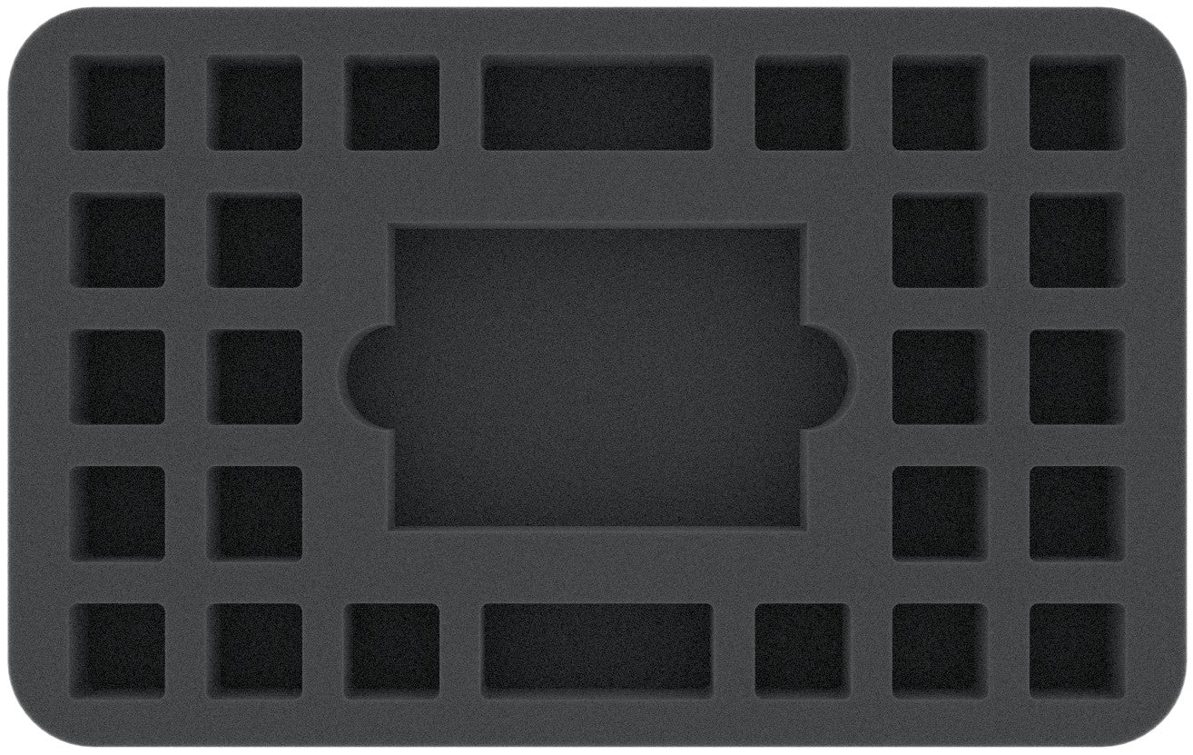 Esta bandeja de espuma Feldherr tiene 27 compartimentos para guardar los dados, cartas y fichas de forma ordenada y segura.