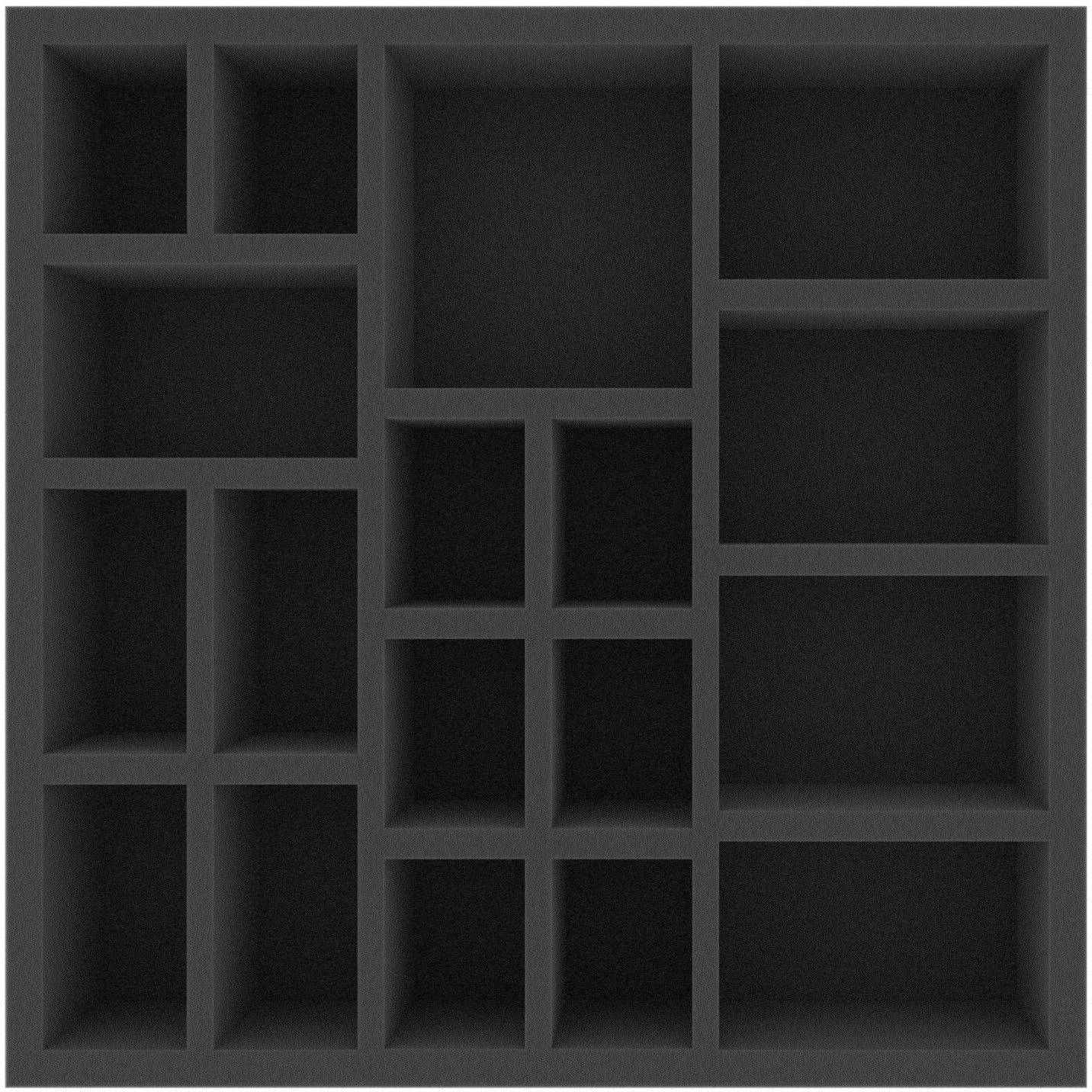 Esta pieza de espuma está dividida en 18 compartimentos. Es especialmente adecuado como inserto para el almacenamiento seguro de miniaturas y material de juego en las cajas originales de juegos de mesa (p. ej., FFG).