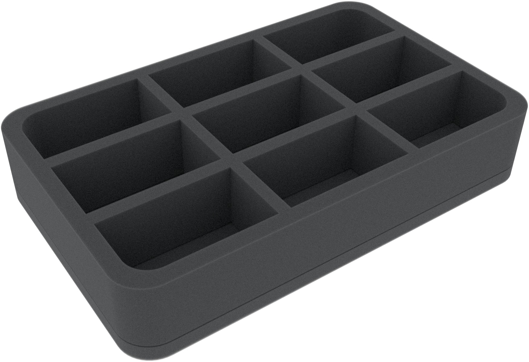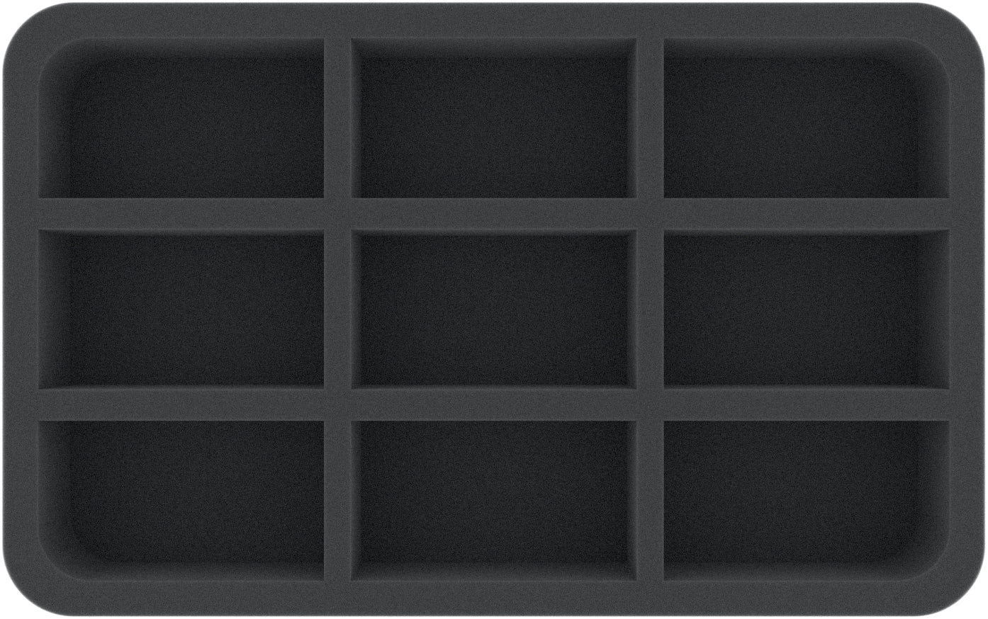 Esta bandeja de espuma Half-Size está dividida en 9 compartimentos del mismo tamaño. Es particularmente adecuado para el almacenamiento seguro de figuras de tamaño pequeño a mediano para varios juegos de mesa y sistemas de mesa. Material de juego u otras piezas pequeñas también se puede guardar perfectamente aquí.