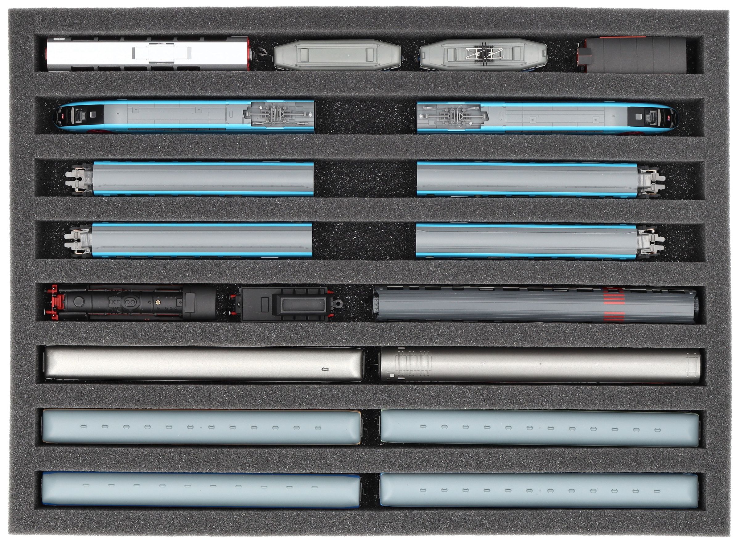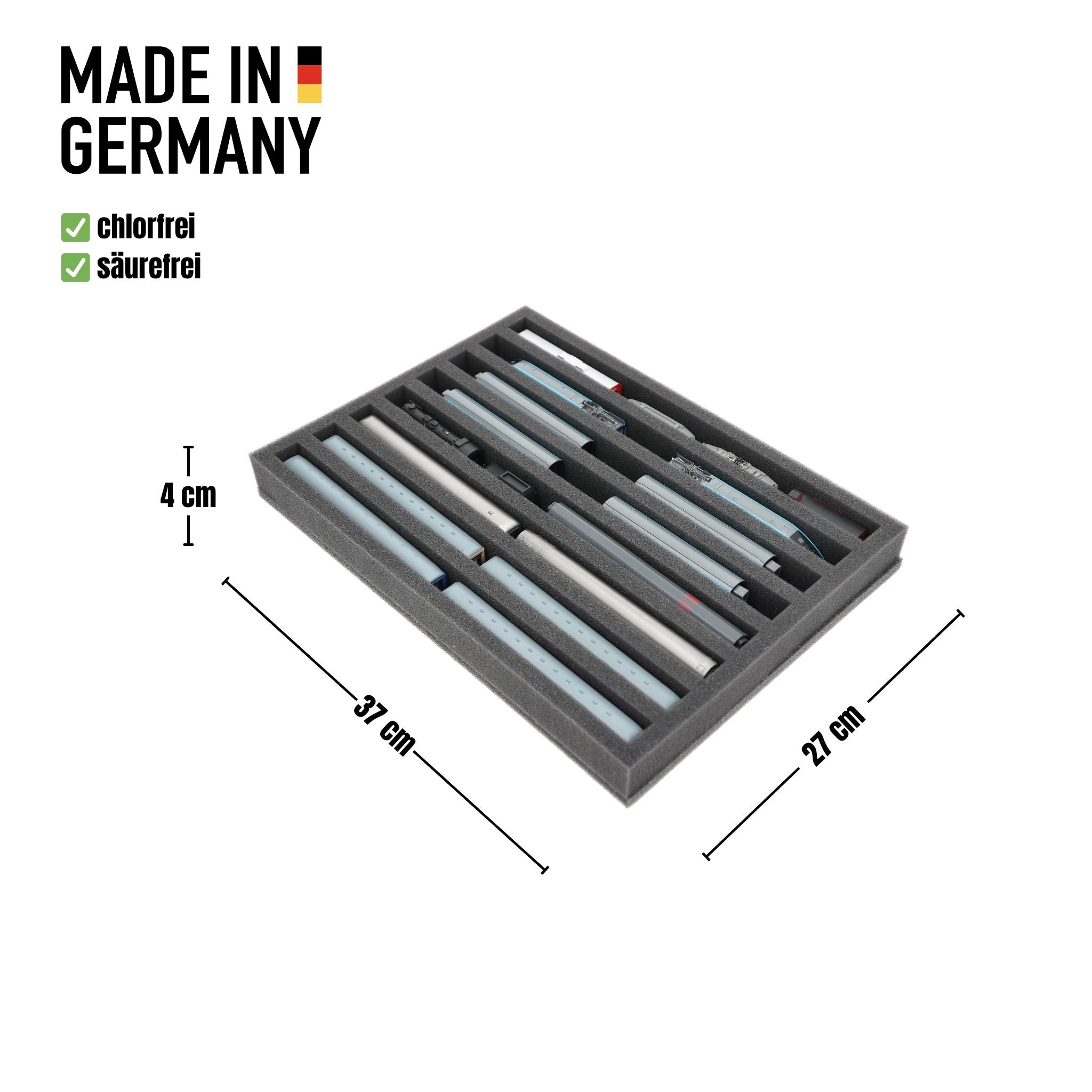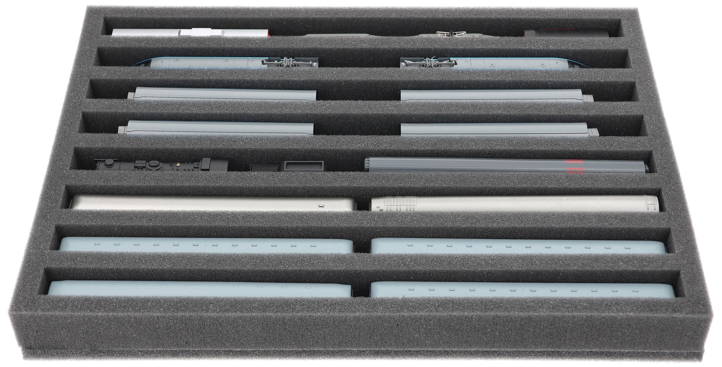IU040A001 Inserto de espuma Feldherr para maquetas de trenes - escala N - 8 compartimentos - para almacenamiento vertical