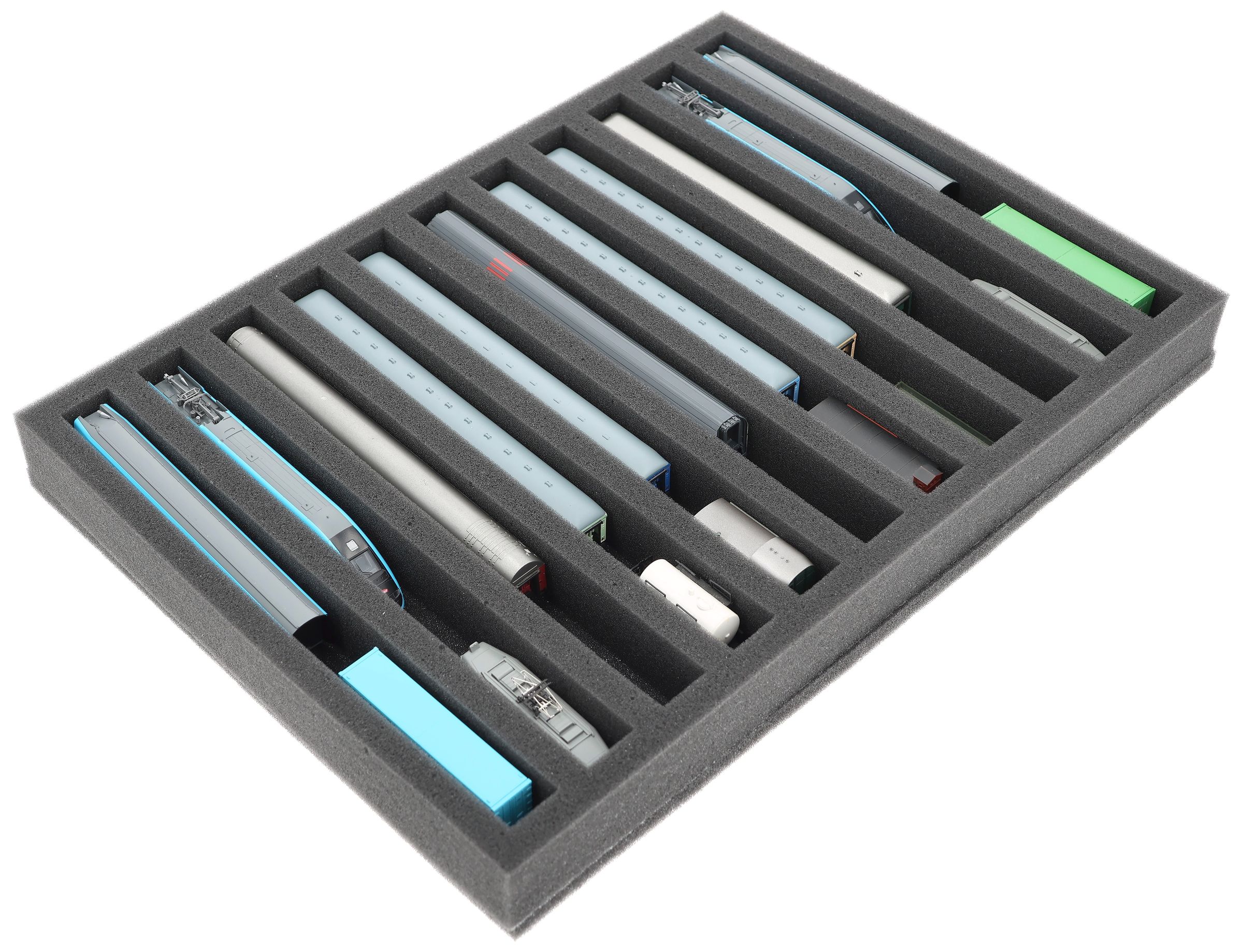 Ya sea para transportarlas a exposiciones, a reuniones de módulos o para guardarlas de forma segura en estanterías en casa, este inserto mantiene sus locomotoras y vagones de escala N protegidos de forma fiable. Los 11 compartimentos mantienen los modelos en posición vertical y los protegen de golpes y arañazos.