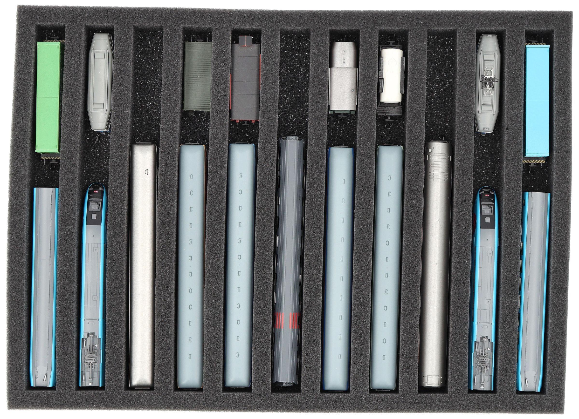 IU040A002 Inserto de espuma Feldherr para maquetas de trenes - escala N - 11 compartimentos - para almacenamiento vertical