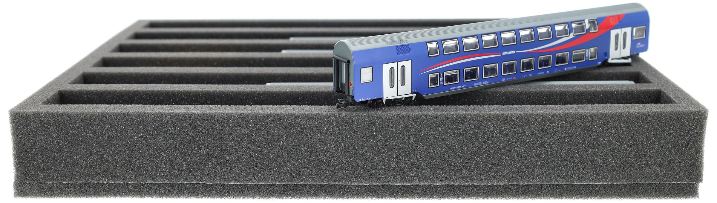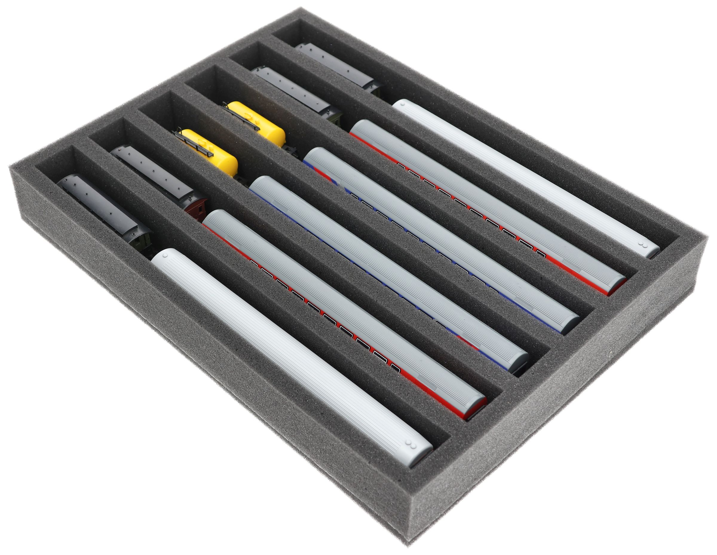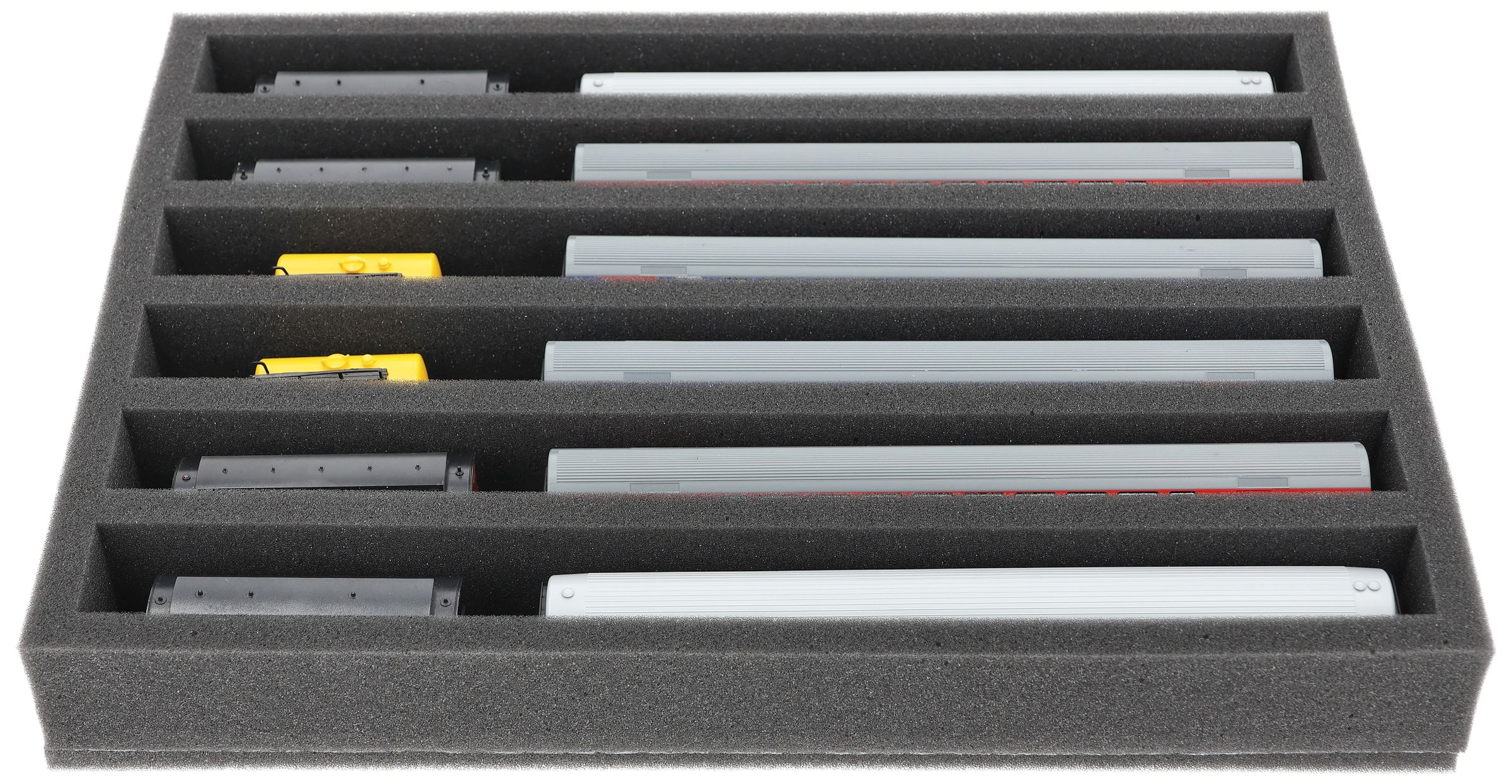 IU050A002 Inserto de espuma Feldherr para maquetas de trenes - escala TT - 6 compartimentos - para almacenamiento vertical