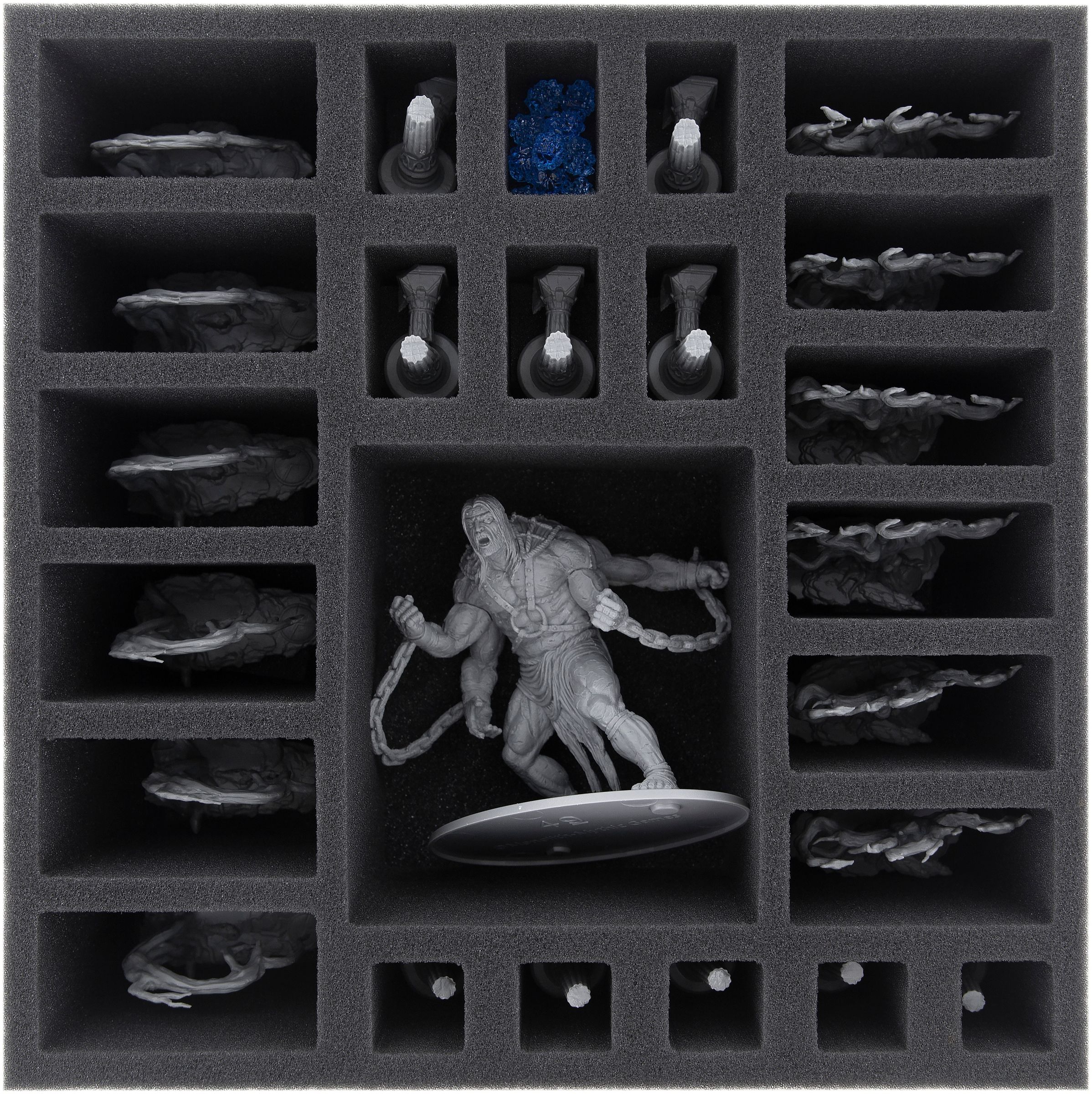 La esterilla inferior de espuma consta de 24 compartimentos de diferentes tamaños, con un compartimiento grande para Atlas y compartimentos más pequeños para los juegos de terreno.