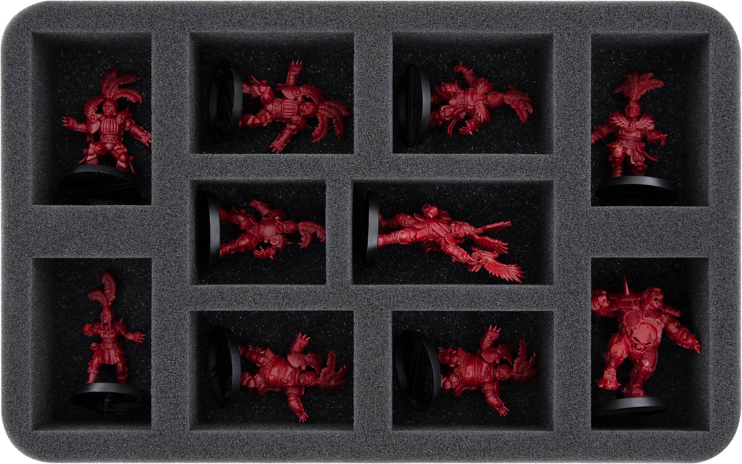 Cada modelo tiene su propio compartimento a medida. Esto asegura que las figuras no se deslicen o choquen entre sí durante el transporte. La espuma suave no sólo protege los detalles sensibles de las figuras. Los colores de las miniaturas pintadas también están a salvo de la abrasión y los arañazos.
