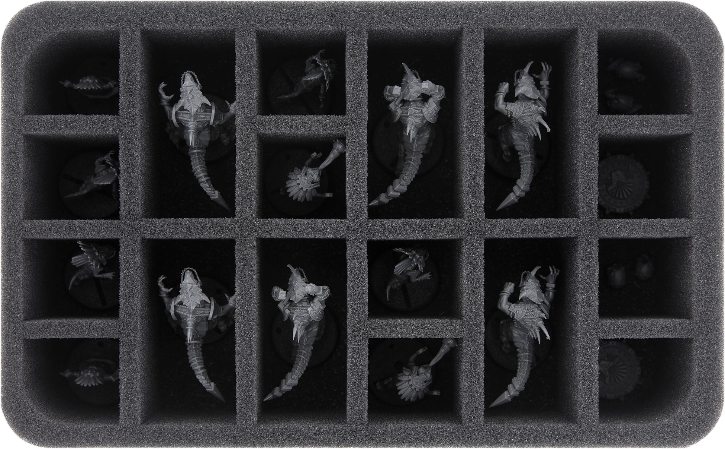 En los 18 compartimentos de esta bandeja de espuma Feldherr Half-Size, a cada jugador de tu equipo de Lizardmen se le asigna su propio compartimiento. Los 6 Bloqueadores de Saurus se alojan en los compartimentos oblongos, en los compartimentos pequeños restantes se distribuyen 4 Skink Runners, 2 Chameleon Skinks, las dos estatuas de Slann, así como las bolas y las monedas de los equipos.