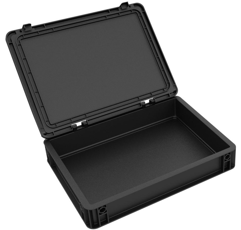 El contenedor ESD Euro de AUER Packaging con tapa de bisagra proporciona una protección adicional para su contenido. La tapa y las bisagras están fabricadas con el mismo material antiestático que los contenedores. Esto evita que se acumulen cargas electrostáticas y que las cargas existentes se descarguen de forma fiable.