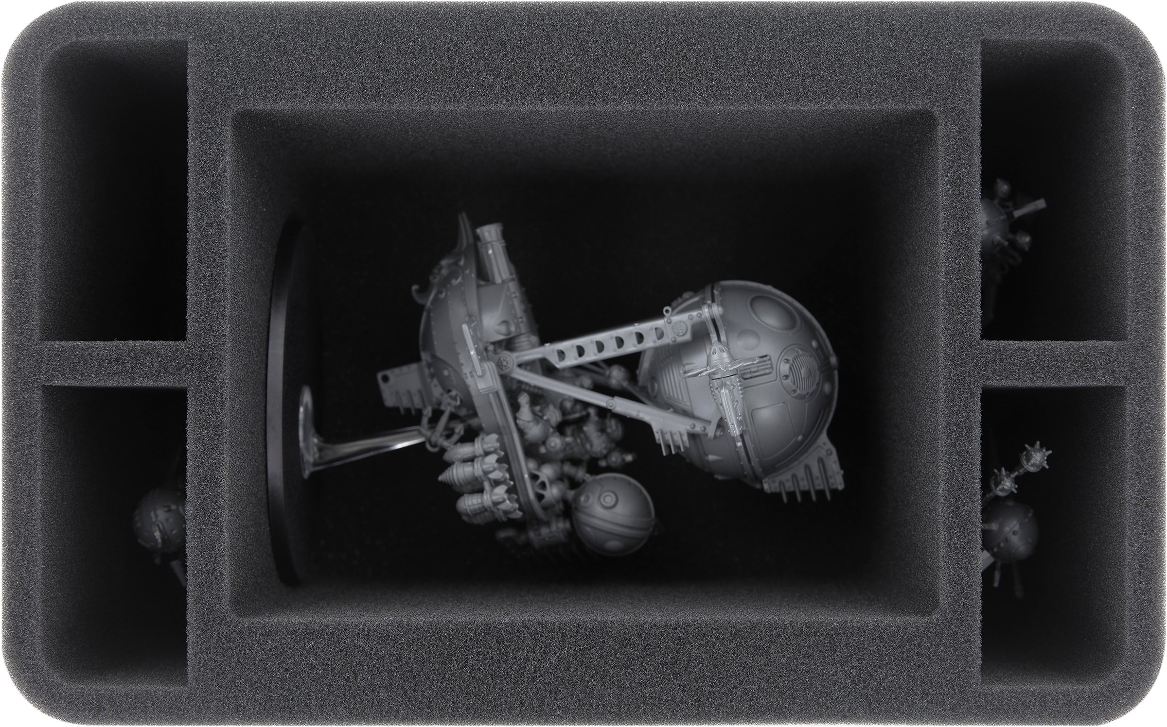 Además del gran compartimento, le quedan 4 compartimentos en los que puede guardar más unidades de los Señores de Kharadron. Son adecuados para muchos modelos sobre bases de 25 mm o 32 mm, como la Compañía Arkanaut o el Aetheric Navigator.