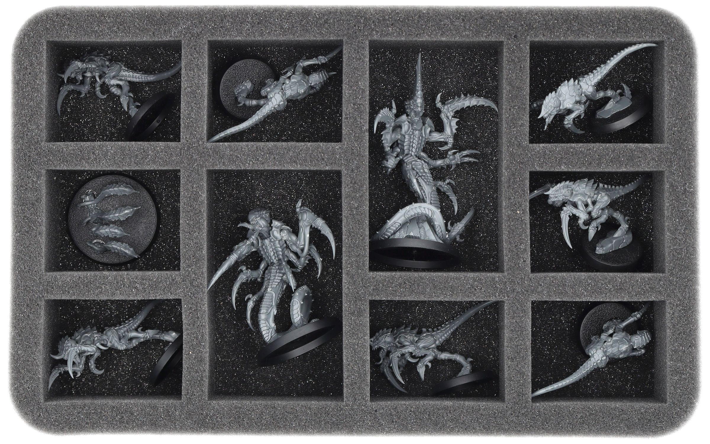 Esta ligera pero resistente caja de almacenamiento FSLB075, que incluye dos inserciones de espuma Feldherr a medida, ofrece una protección fiable para tus Raveners y Hormagaunts del Kill Team: Typhon Starter Set.