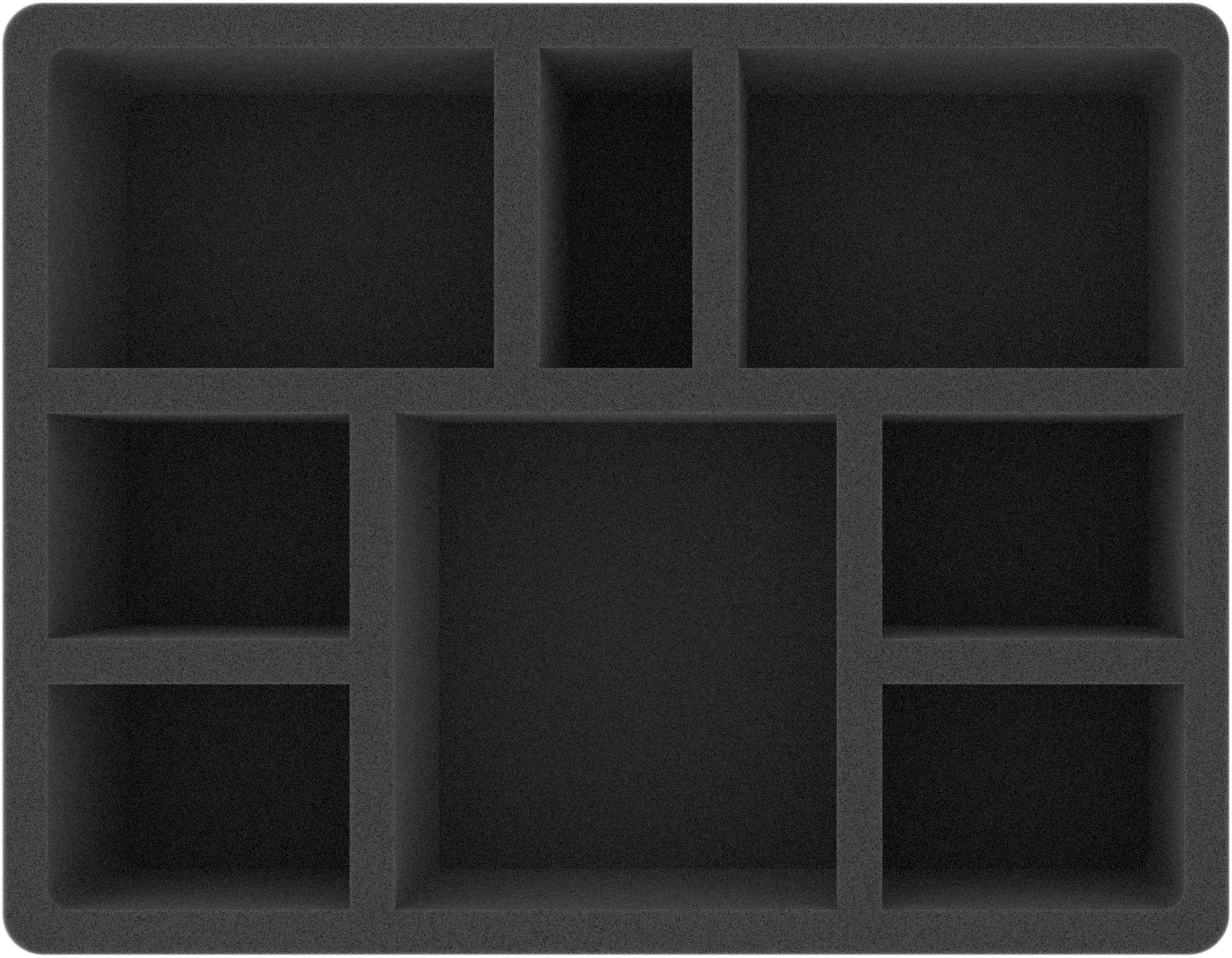 This foam tray has 8 compartments for the safe and orderly storage of tabletop- and board game miniatures. It is also well-suited to clearly sort board game material like e. g. dice and tokens. The high-quality foam provides reliable protection against damage – fragile parts stay intact, surfaces remain unharmed.