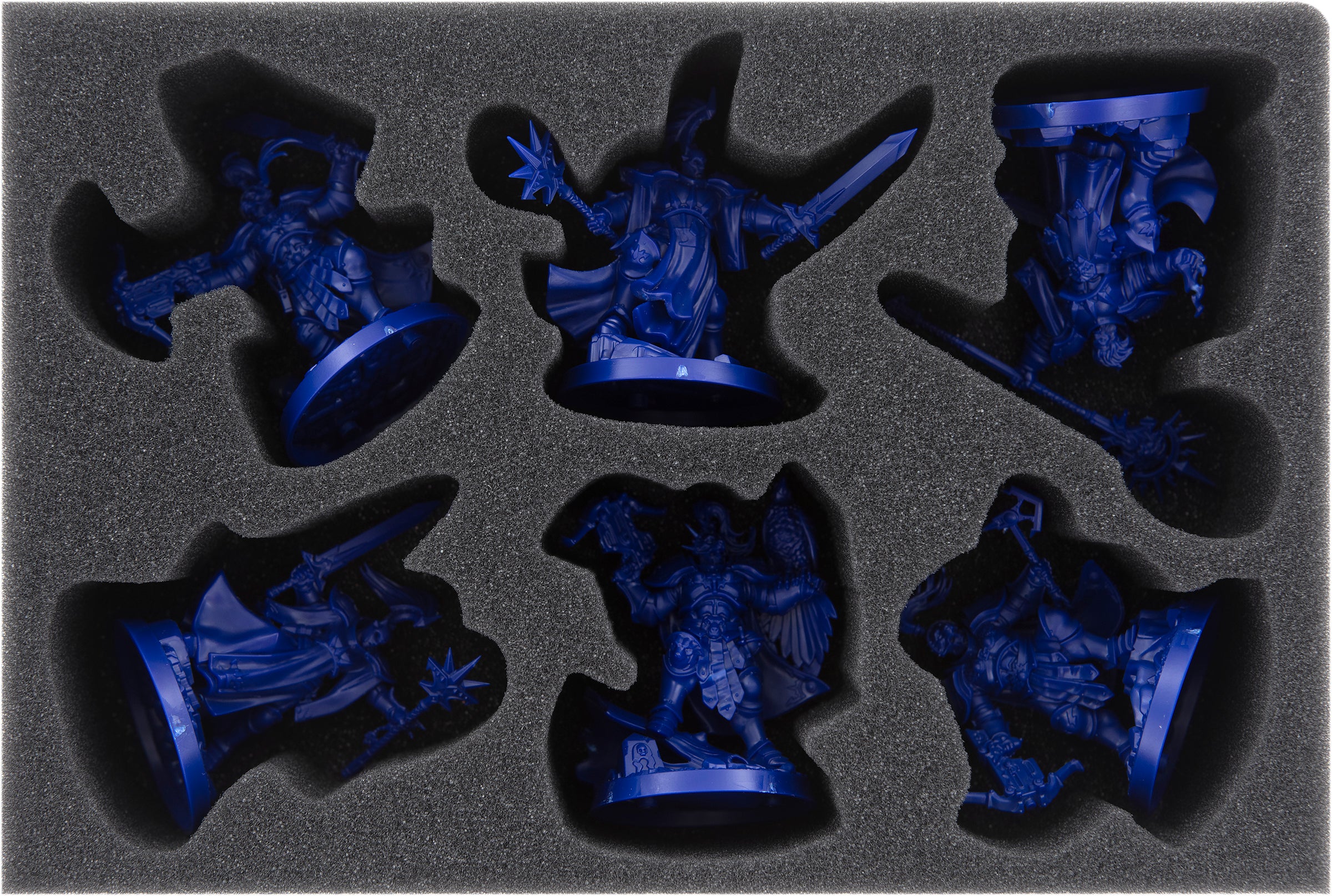 La incrustación está dividida en 6 compartimentos de corte en miniatura para Alya el Stalwart, Uran Trueblade, Thurnos Brightsoul, Oswin el Swift, Quain Hawksight y Bran Surebolt.