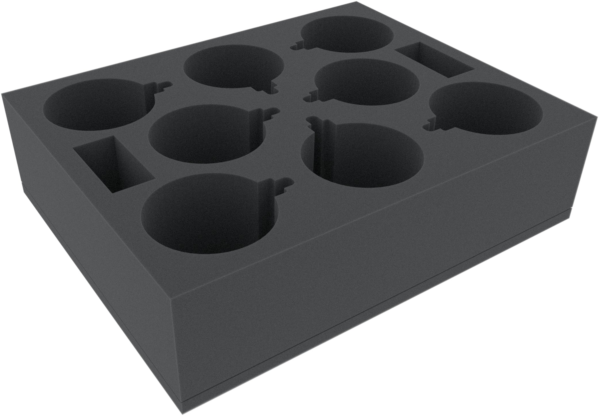 A 90 mm high Feldherr Full-Size foam tray with 8 circular compartments of 80 mm diameter with small bell- or lamp-shaped extension.