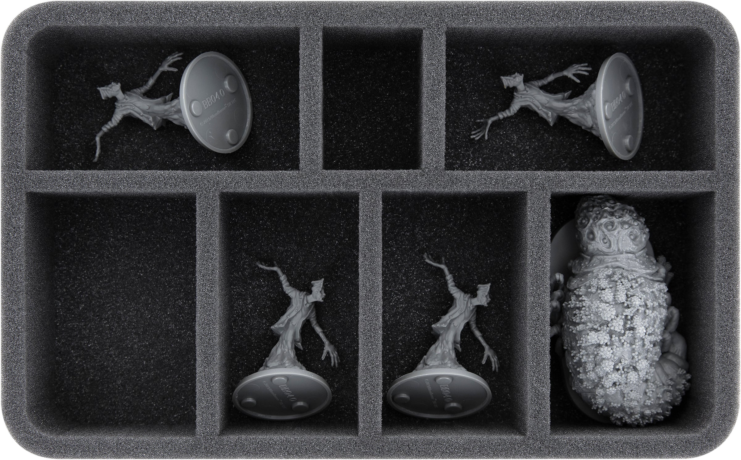 Se incluyen dos inserciones Half-Size para proteger las 13 miniaturas de la expansión de Byrgenwerth. Desde el Erudito hasta los hijos de Rom, pasando por la propia araña vacía, Rom, cada figura encontrará un lugar seguro donde guardarse. Los compartimentos a medida para cada modelo garantizan que las figuras tengan una sujeción firme y segura. Incluso cuando se transportan por las antiguas y sinuosas escaleras, nada resbala. La espuma suave y de poros finos protege los detalles delicados para que no se rompan y los colores de sus modelos pintados para que no se rayen ni se desgasten.