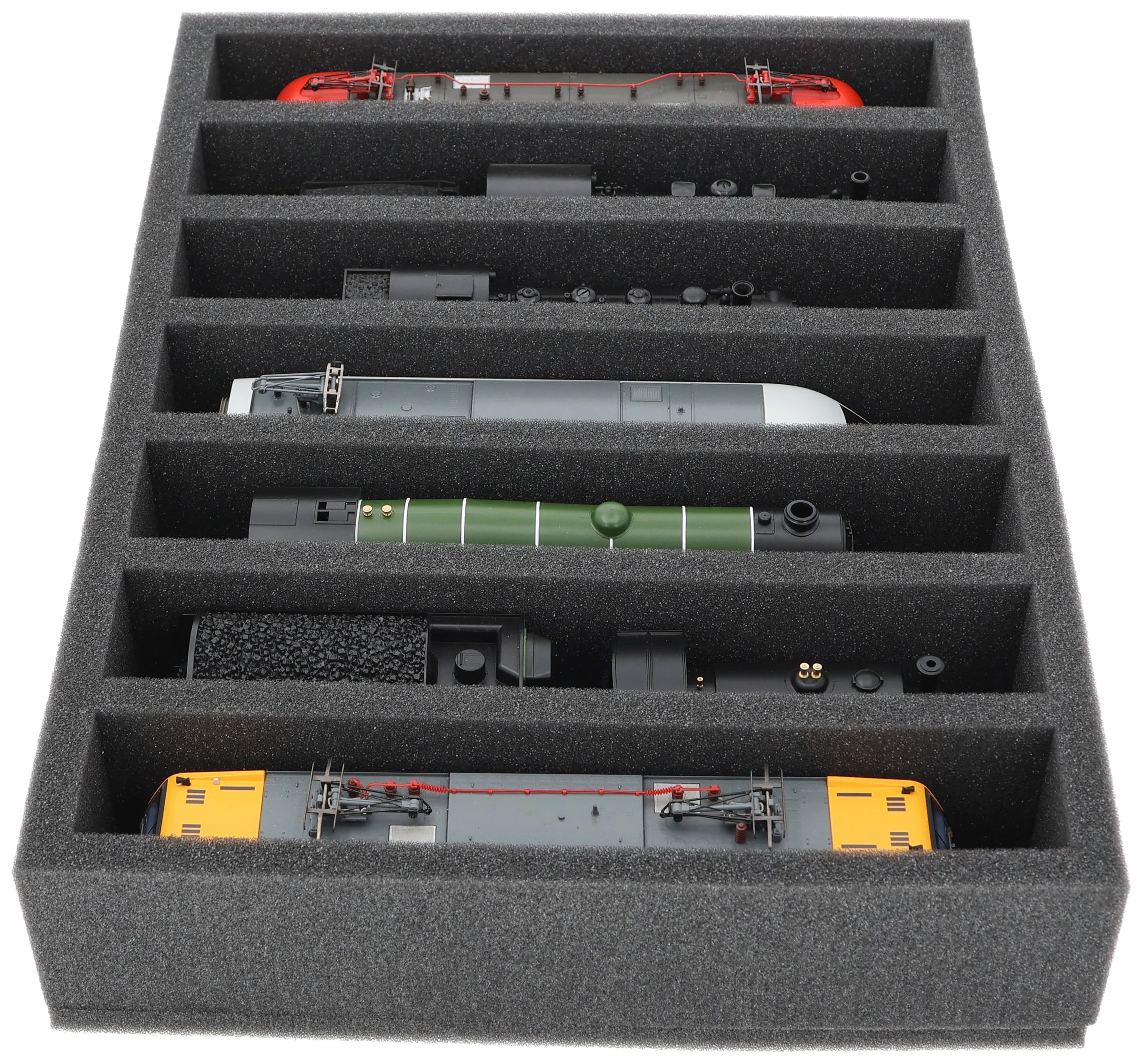 Ya sea para transportarlas a exposiciones, a reuniones de módulos o para guardarlas de forma segura en estanterías en casa, este inserto mantiene sus locomotoras y vagones de escala 00 protegidos de forma fiable. Los 7 compartimentos mantienen los modelos en posición vertical y los protegen de golpes y arañazos.