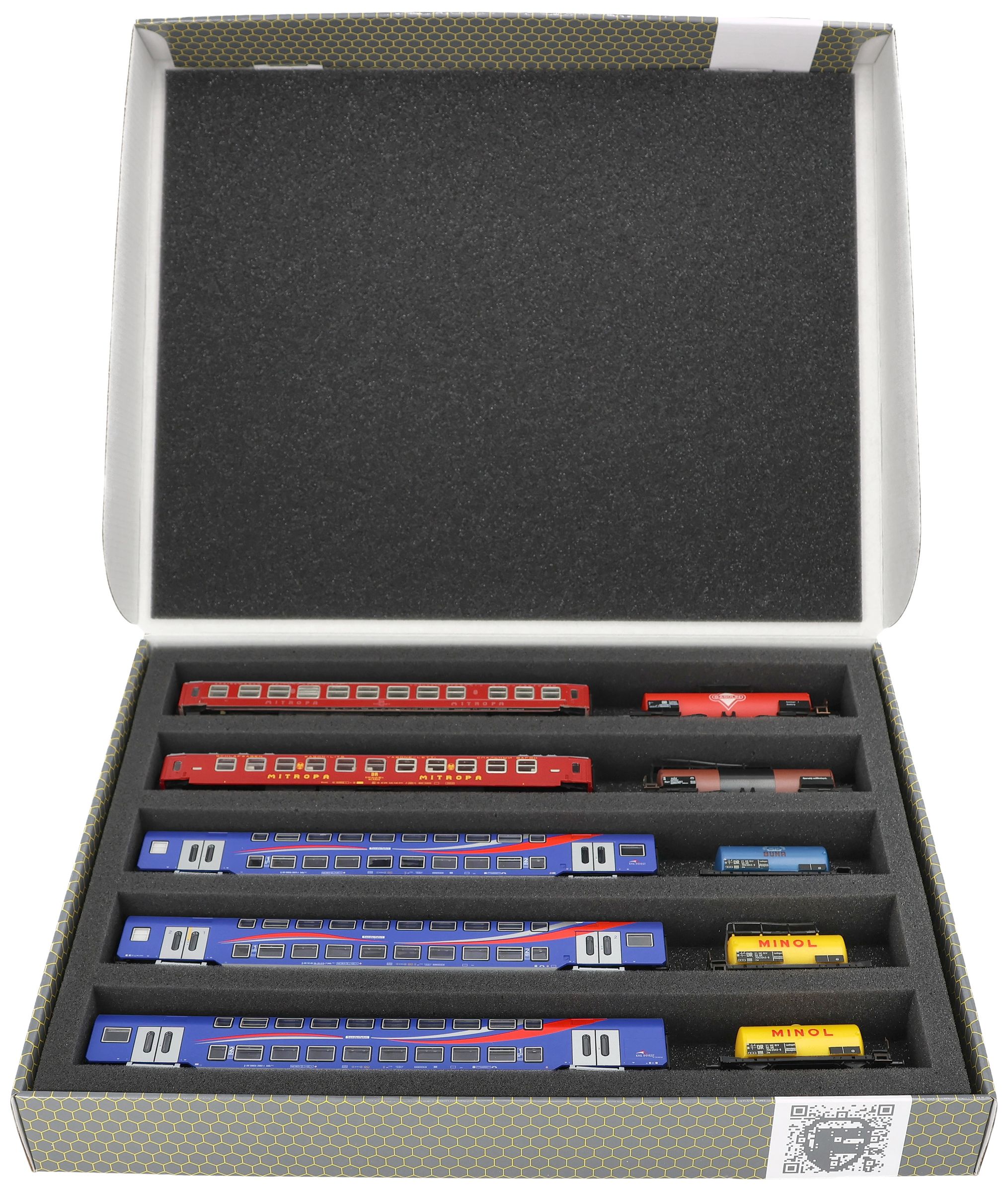 Los vagones y las locomotoras se almacenan en los cinco compartimentos de ajuste preciso. En un mismo compartimento se pueden guardar varios vagones. Para evitar que durante el transporte se produzcan golpes o acoplamientos involuntarios, los modelos pueden separarse entre sí con los separadores incluidos en el juego. Los vagones, locomotoras y vehículos se almacenan de forma segura y están protegidos por la espuma de polietileno de alta calidad que los rodea contra daños y arañazos de pintura.