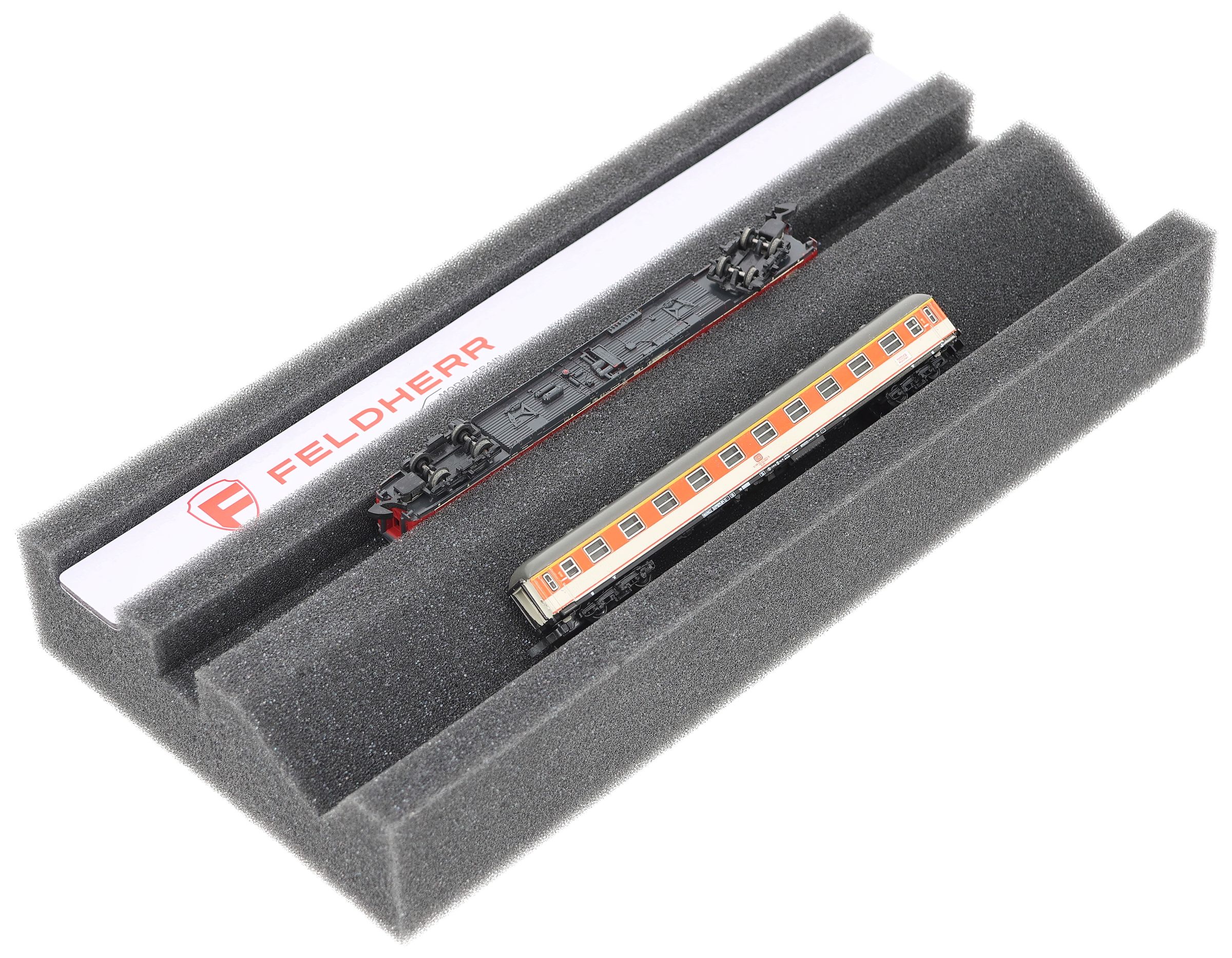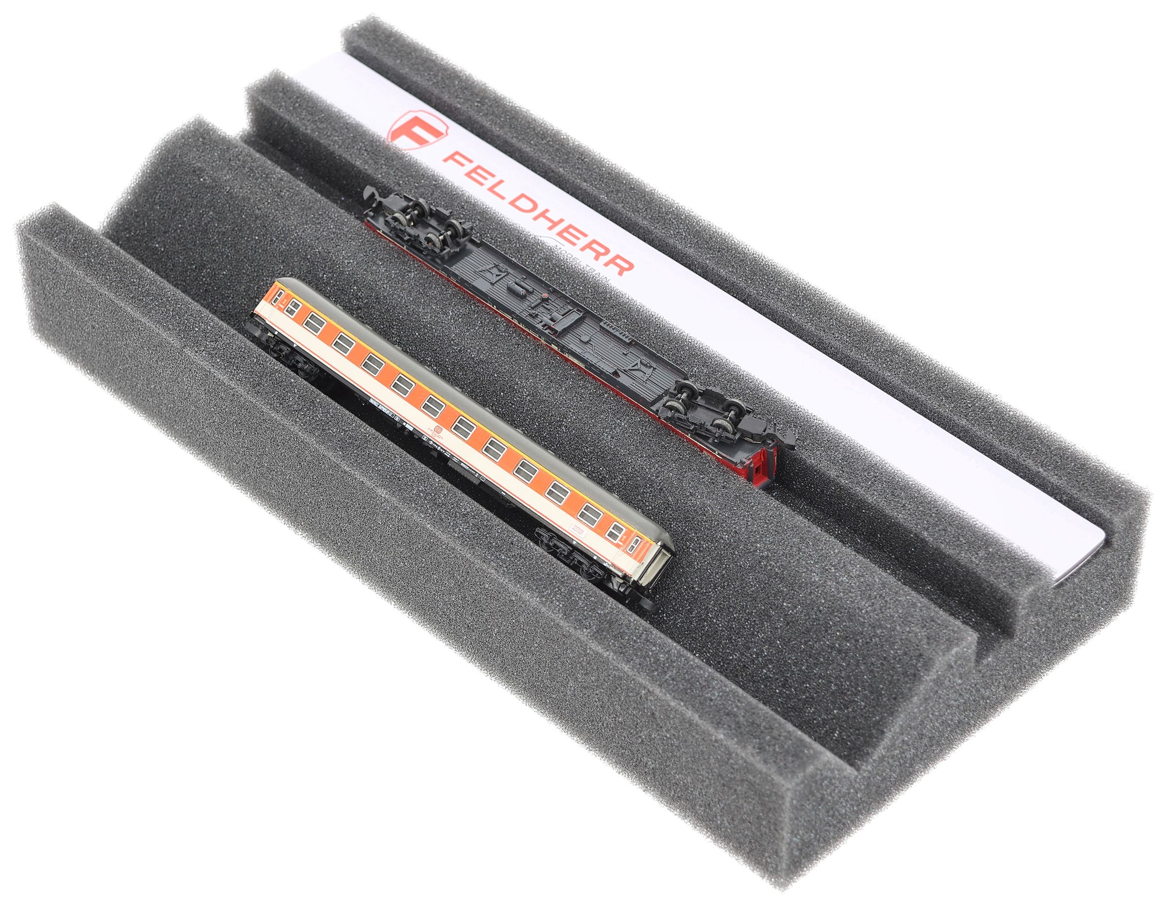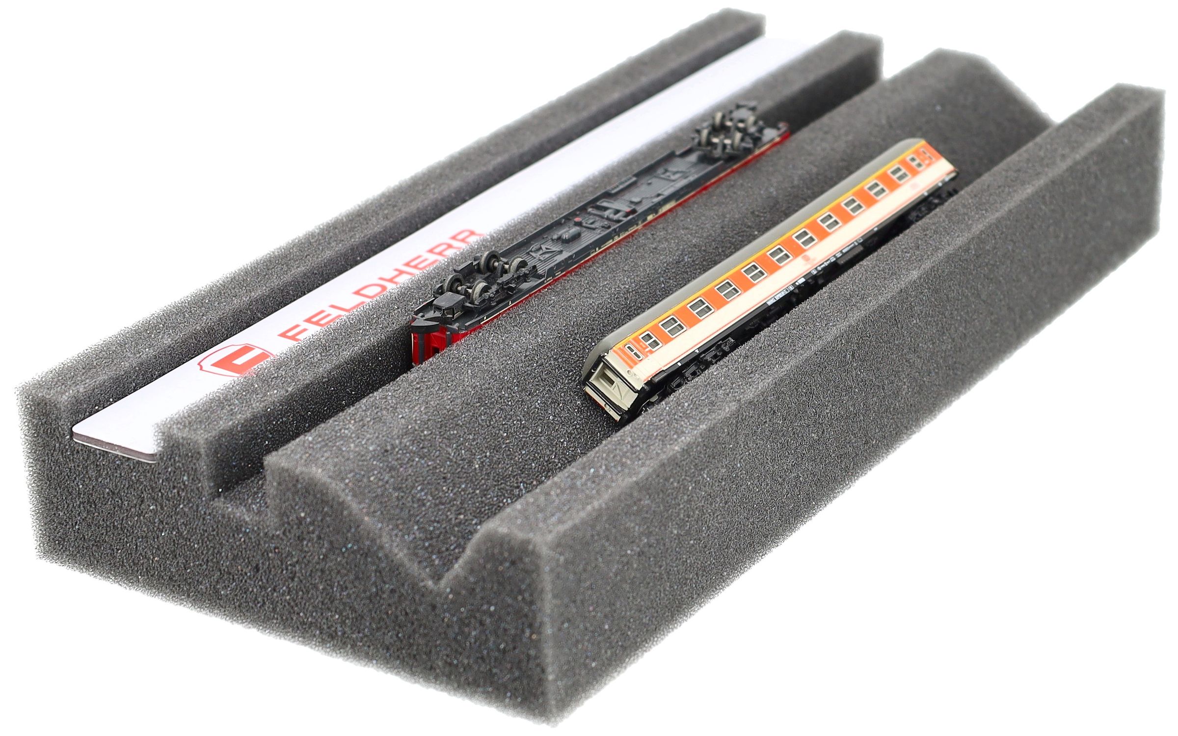 Como todos nuestros productos, el soporte para locomotoras de escala Z se fabrica con precisión alemana. La espuma P.U. de primera calidad utilizada proporciona una combinación ideal de estabilidad y protección para los componentes extremadamente sensibles de las maquetas de trenes a escala Z. A diferencia de las soluciones improvisadas, nuestro soporte para locomotoras a escala Z especialmente desarrollado protege las superficies más sensibles de sus valiosas maquetas a escala Z de arañazos y otros daños.