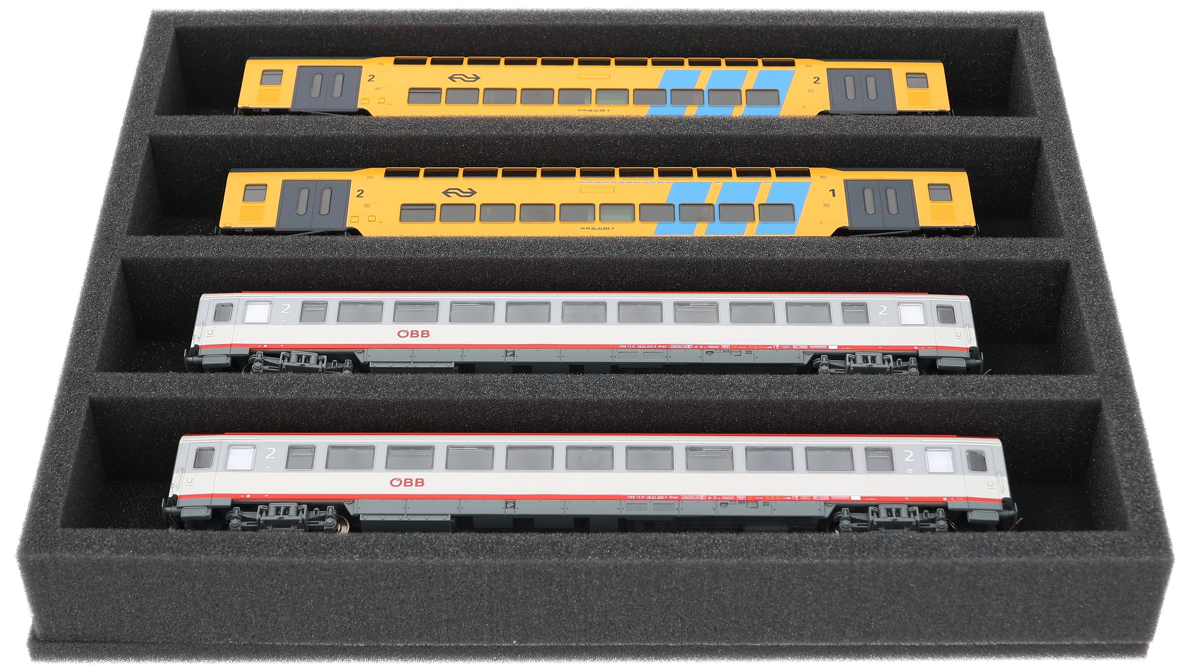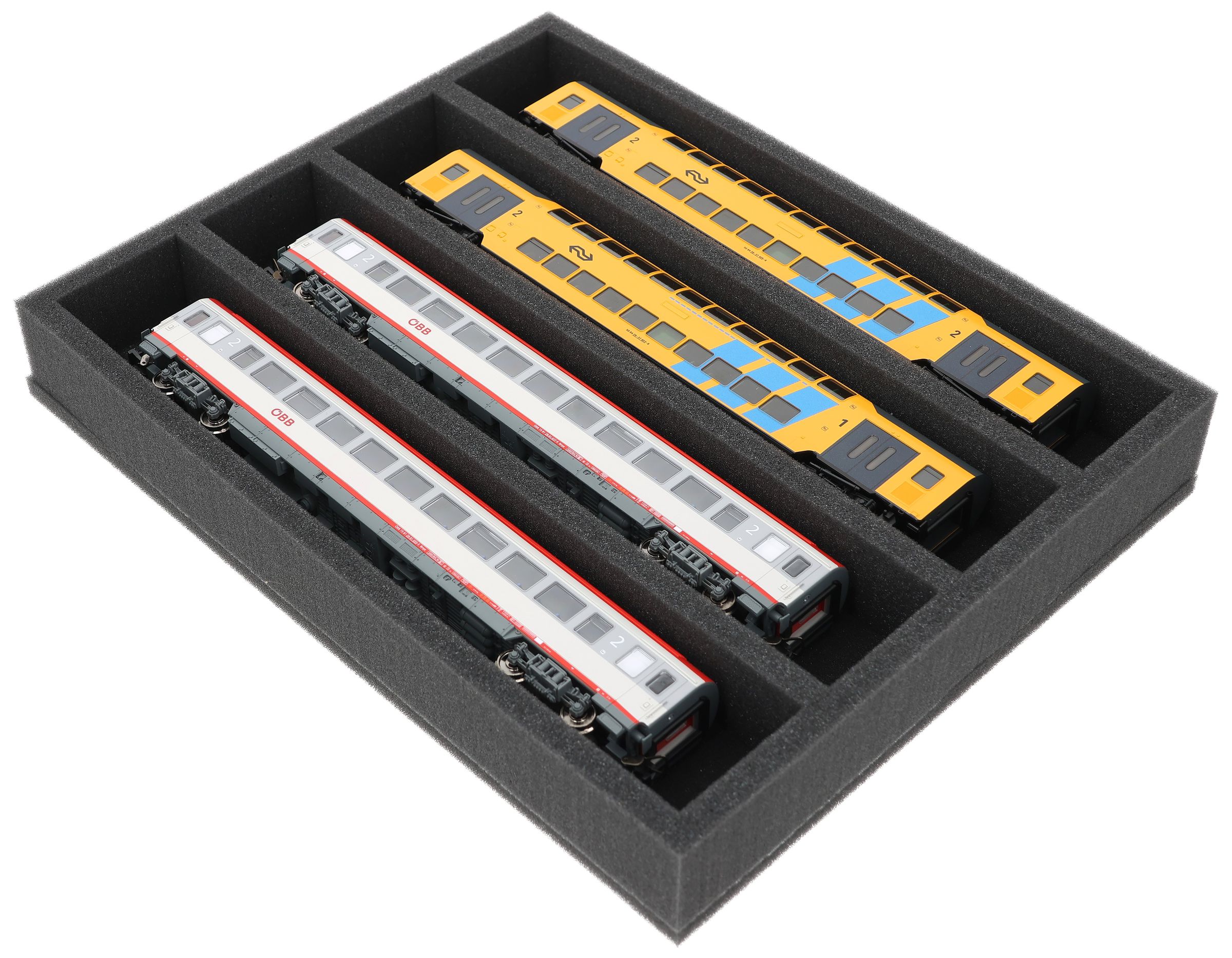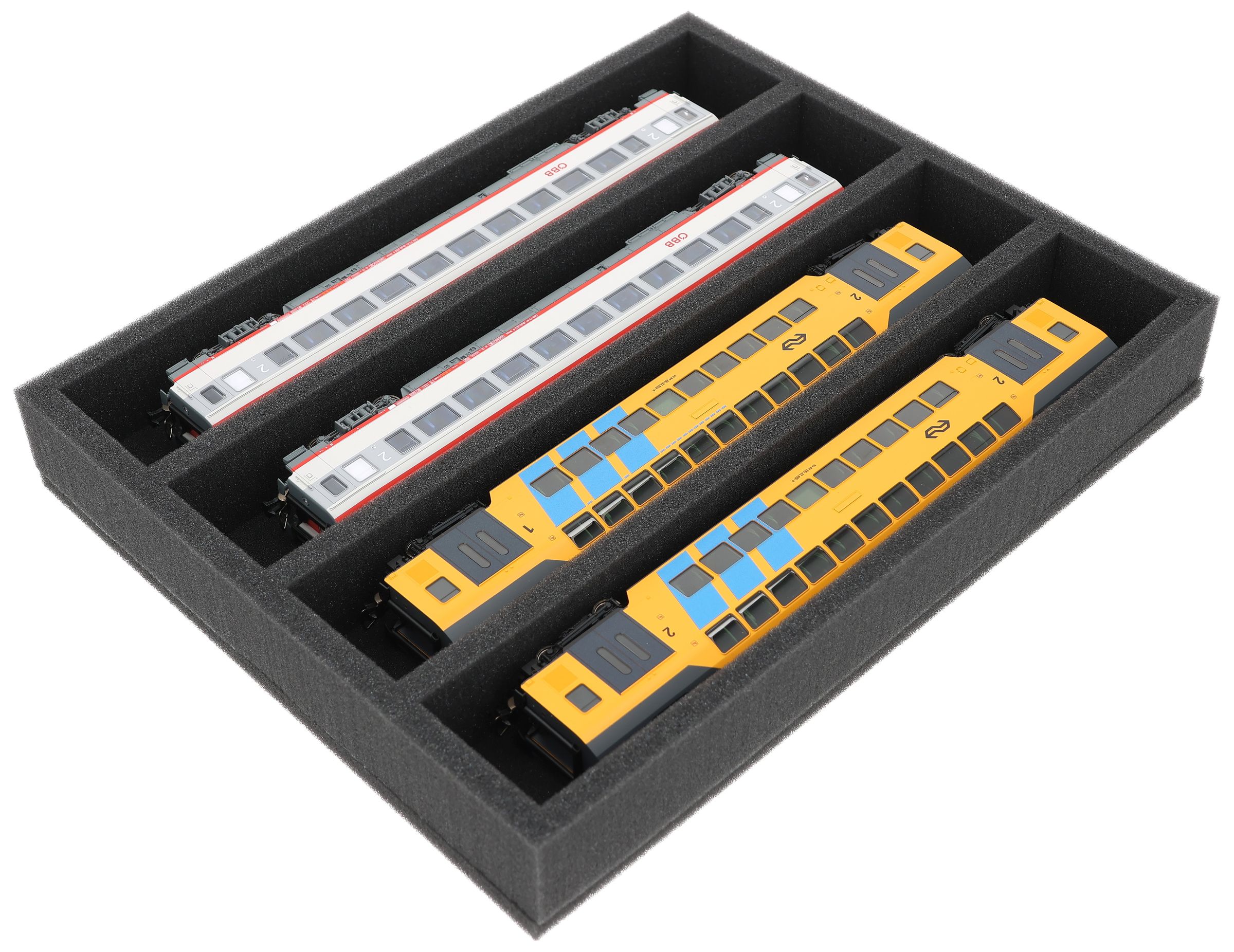 FS050A005 Incrustación de espuma Calibre H0 - horizontal - 4 ranuras para locomotoras, vagones y vehículos de modelismo ferroviario