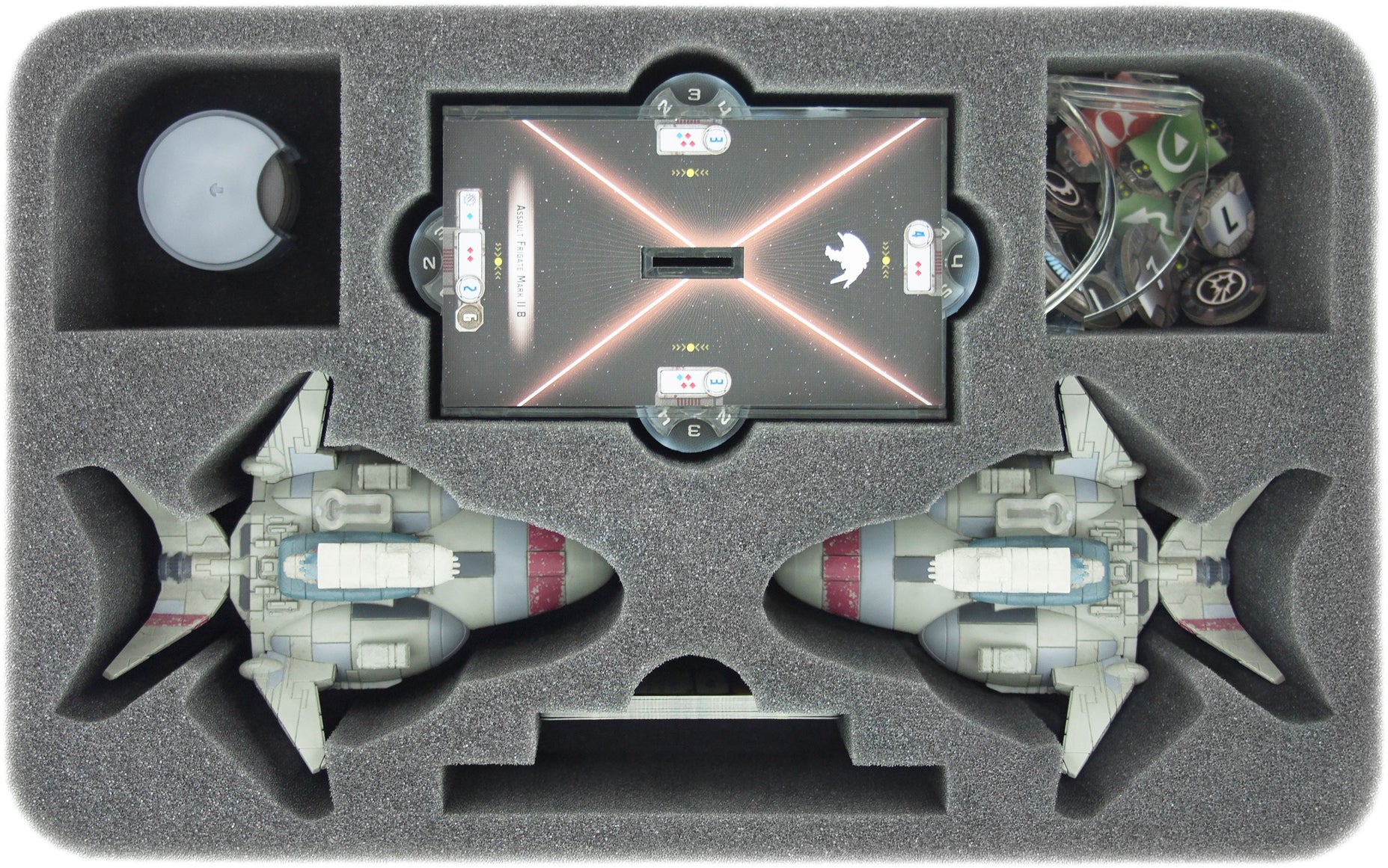 Especialmente para la Armada de asalto Star Wars Frigate Mark II bandeja de espuma a medida. Hay suficiente espacio para almacenar dos fragatas de asalto Mark II, bases y espacio extra para fichas o dados.