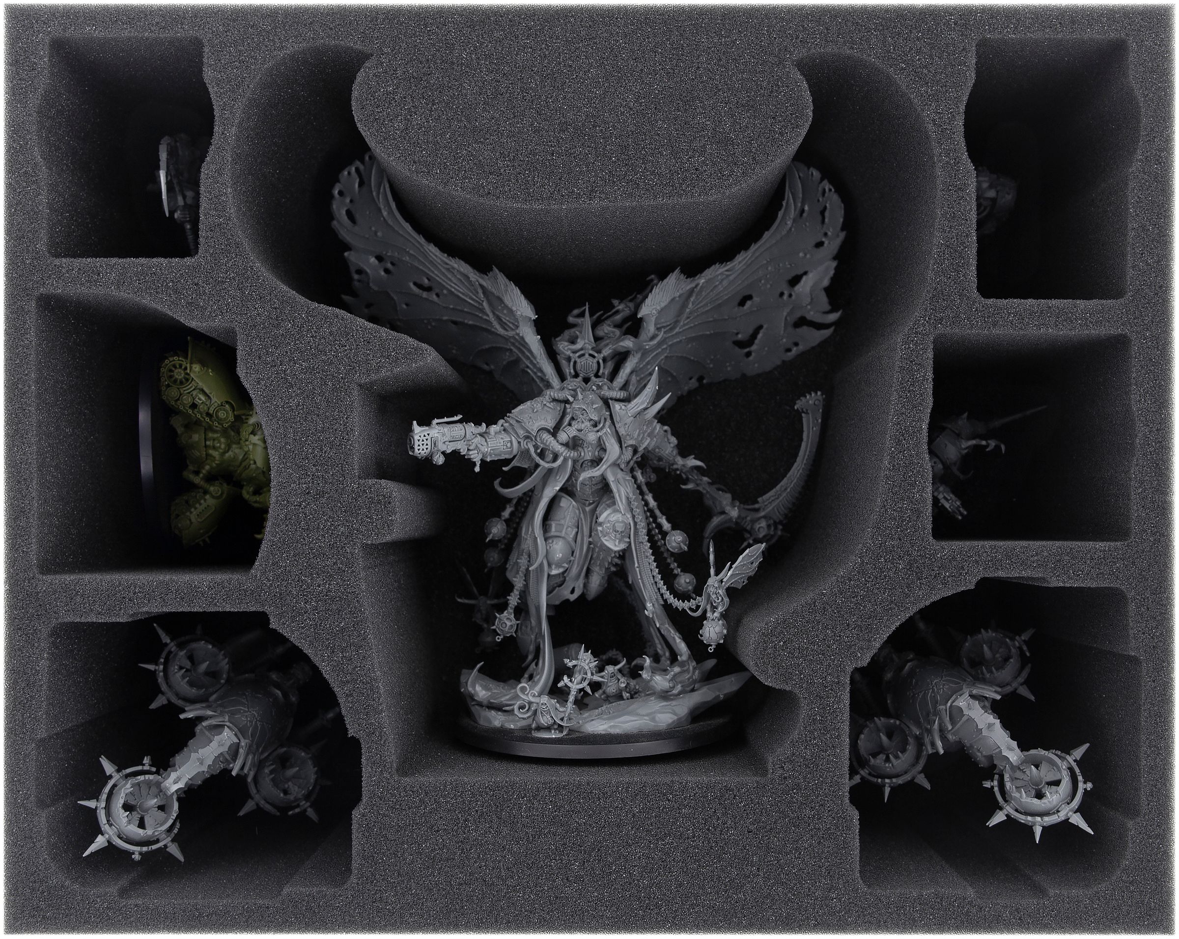 Para mantener intactas estas enormes alas, la guadaña y los Drones Nurgling, diseñamos esta bandeja de espuma Full-Size para ti. Con un compartimento adaptado exactamente a Mortarion, ofrece una protección óptima para este magistral Taller de Juegos modelo.