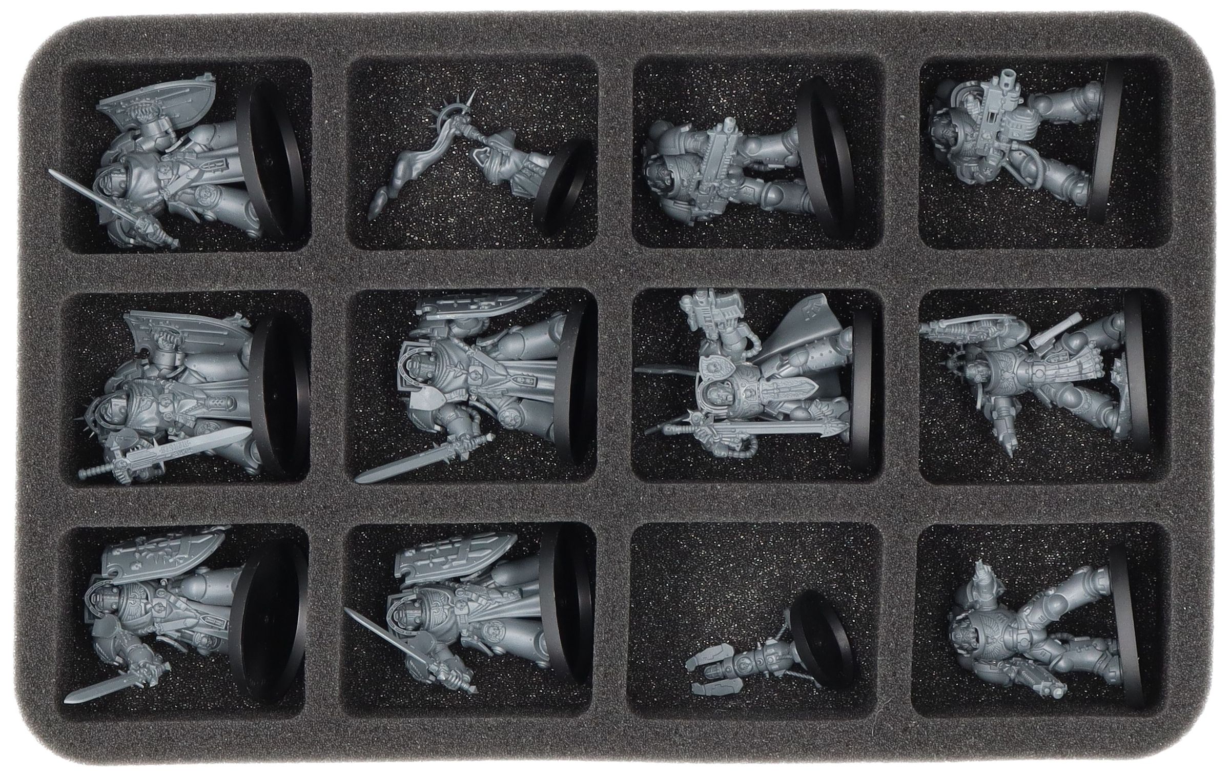 En este Half-Size bandeja de espuma tienes espacio para hasta 12 miniaturas de tu ejército de Marines Espaciales. El inserto es ideal para Caballeros Alamuerte, Terminators o Intercesores Pesados.