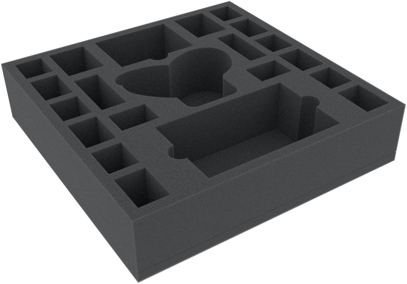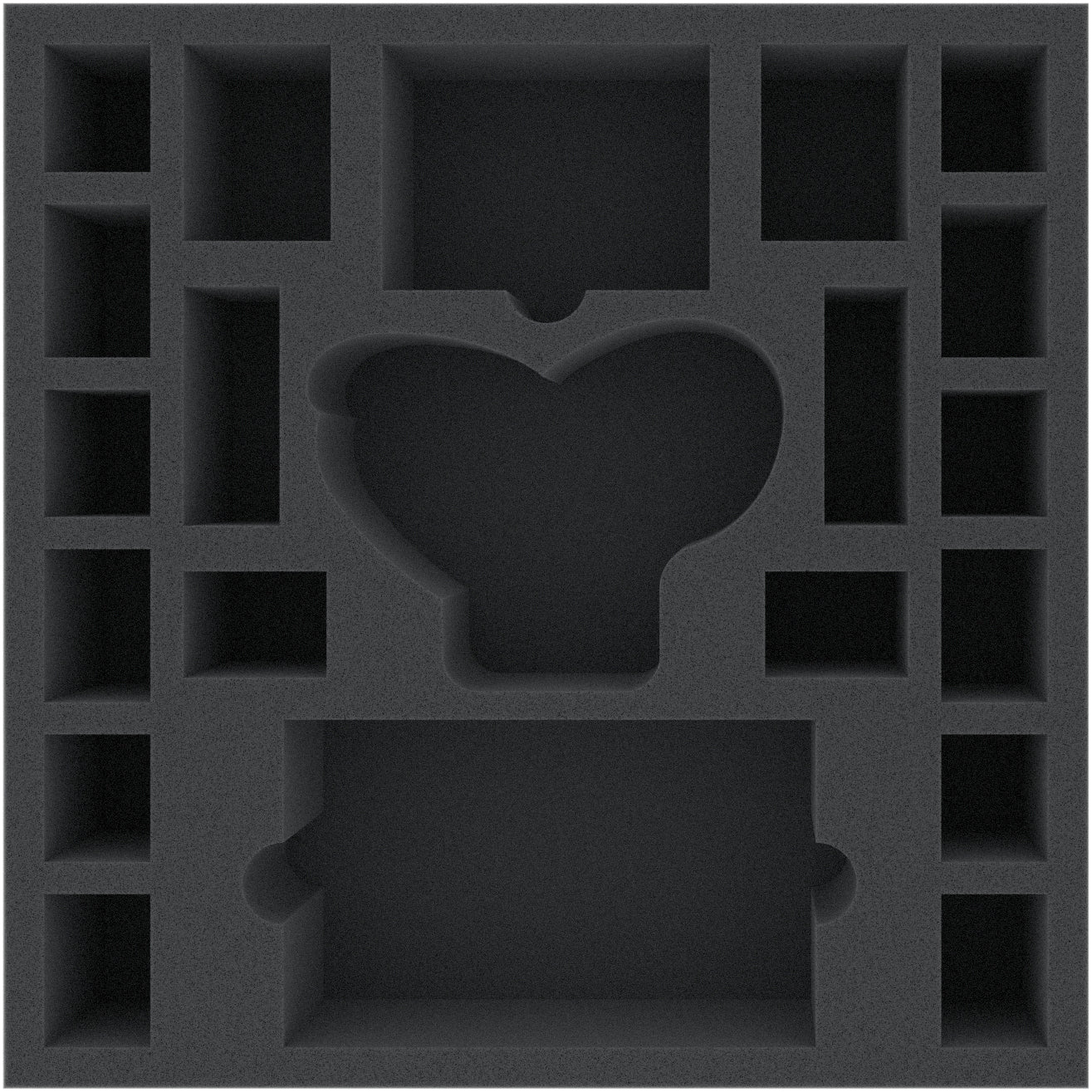 Esta bandeja de espuma tiene 21 compartimentos para el almacenamiento seguro y ordenado de miniaturas, tarjetas y fichas de la ampliación "Espada y Hechicería" "Portal Arcano". La bandeja de espuma cabe exactamente en la caja original del juego.