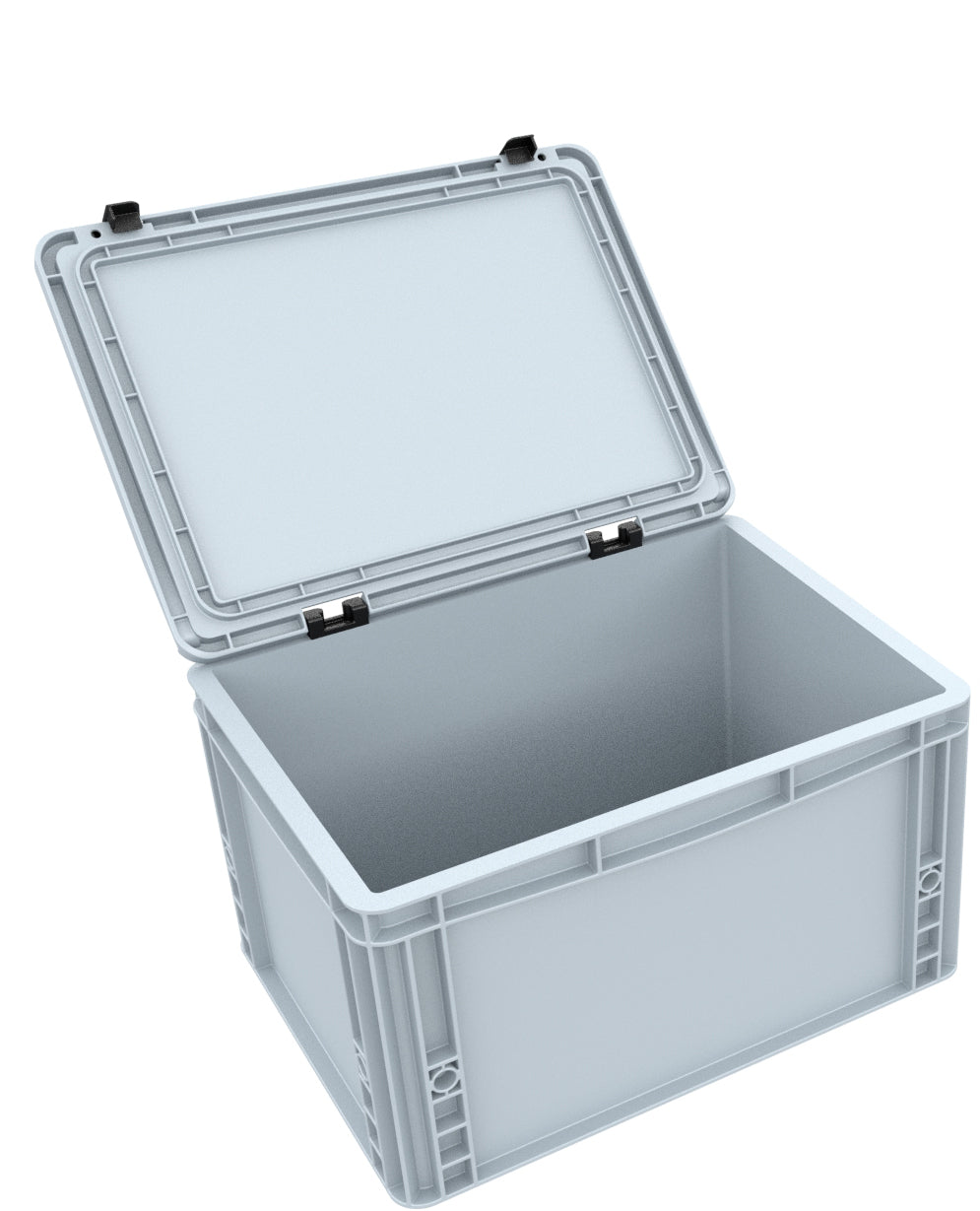 El eurocontenedor con tapa de bisagra de AUER Packaging se puede cerrar en un abrir y cerrar de ojos gracias a su sistema de bisagras de fácil manejo. De este modo, su mercancía queda protegida de forma óptima contra daños durante el transporte y la contaminación.