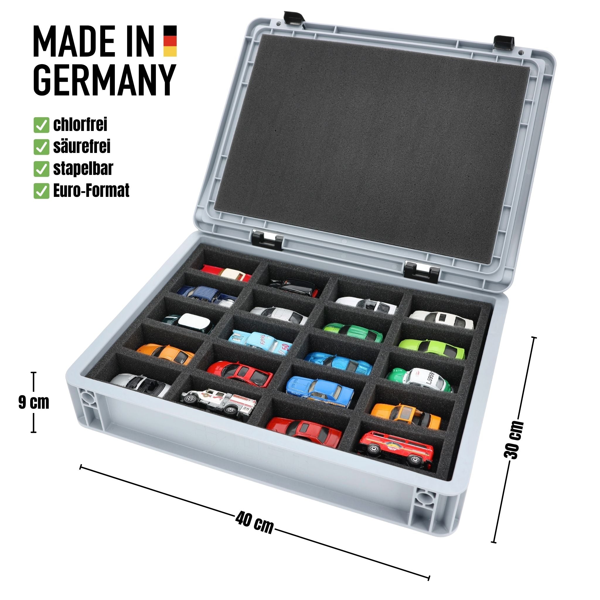 - Inserto de espuma de precisión con 20 compartimentos para vehículos de fundición a presión a escala 1:64 - dimensiones de los compartimentos aprox. 80 x 42 x 30 mm