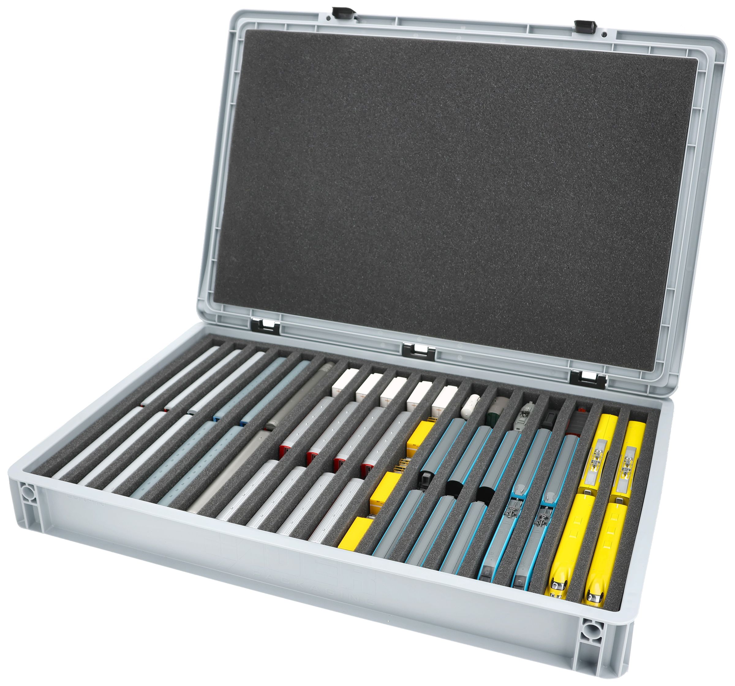 Los 18 compartimentos de igual tamaño (cada uno de aprox. 345 x 20 x 30 mm) están especialmente diseñados para modelos de escala N. Dependiendo de su longitud, las locomotoras y los vagones pueden colocarse uno al lado del otro. El ajuste exacto garantiza que las maquetas queden bien sujetas y no se deslicen durante el transporte.