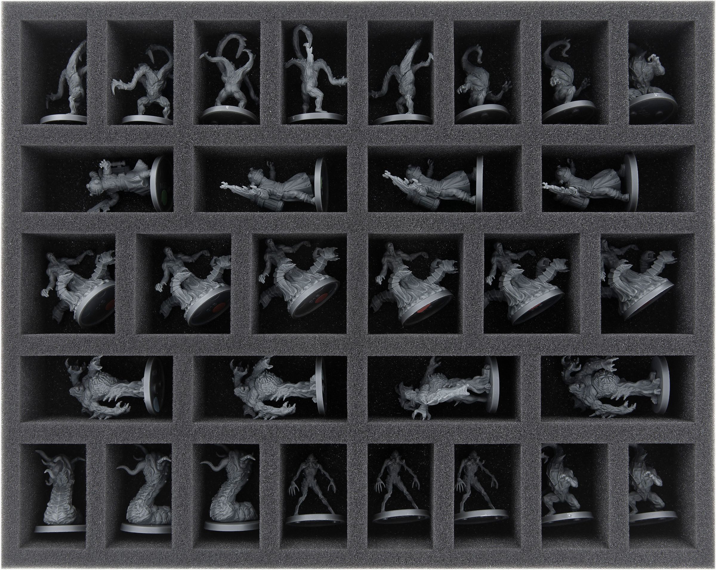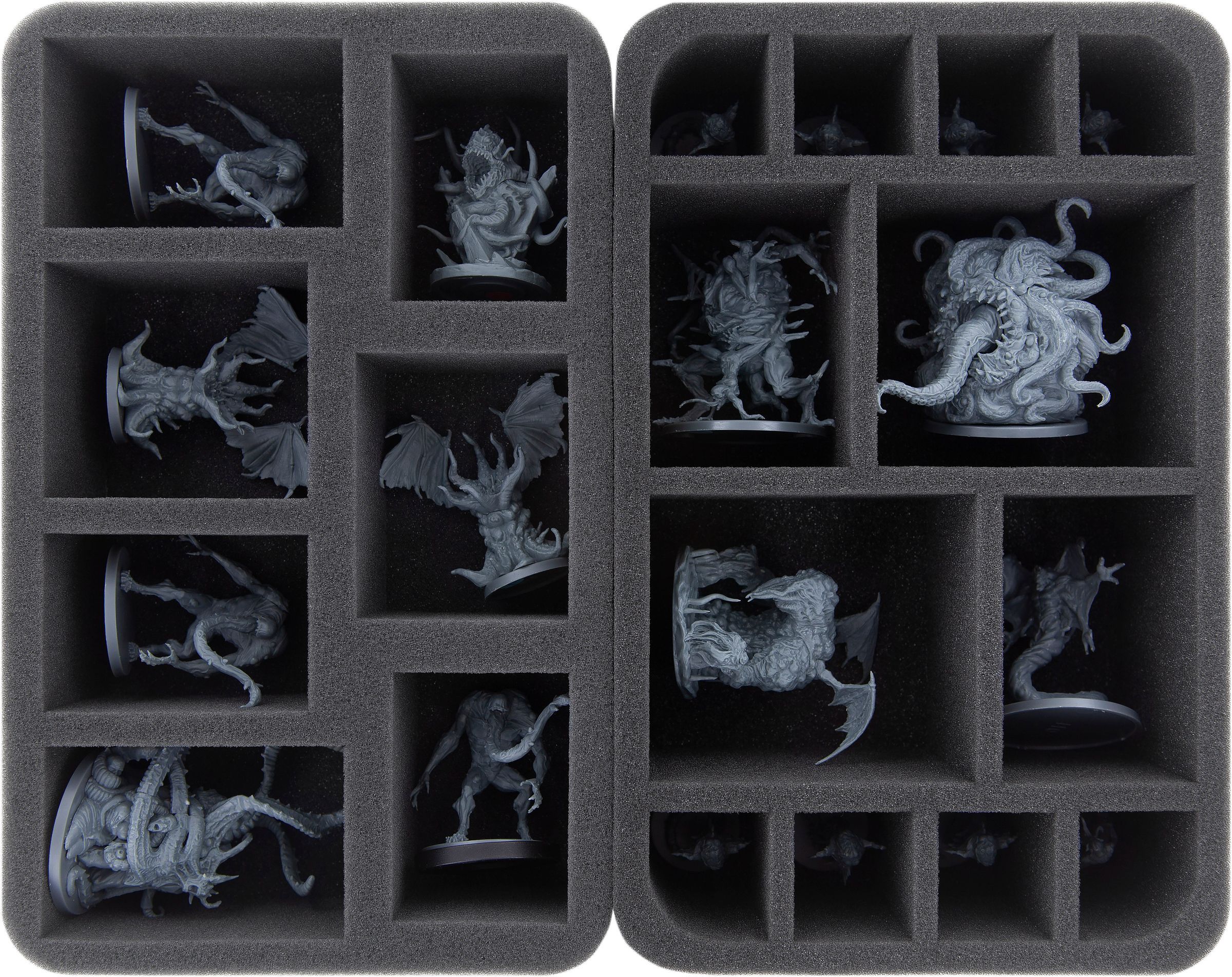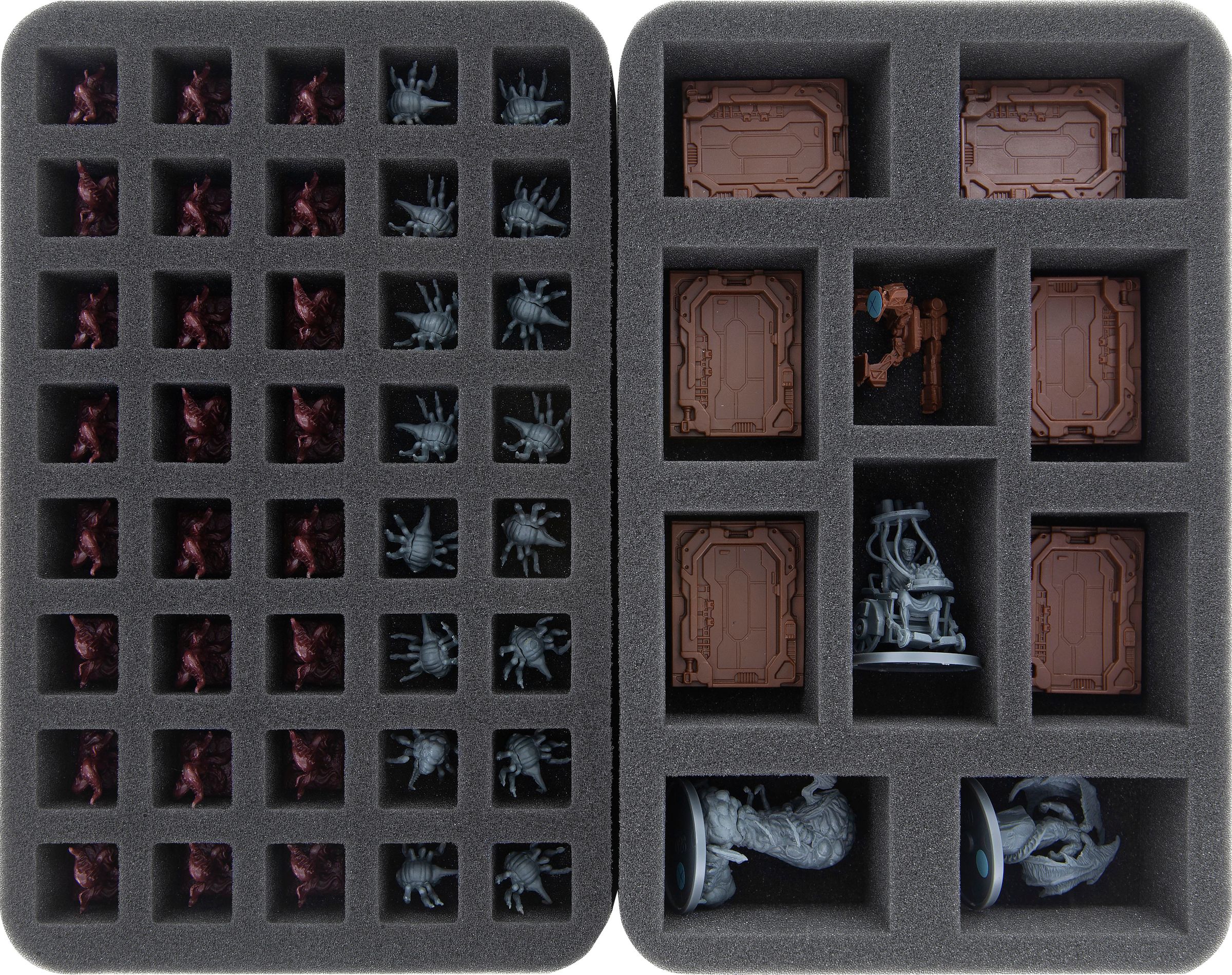 Ya sea Devorador de Mundos, David y Pris o Mutilación - sus miniaturas están seguras en la espuma de poros finos Feldherr. Cada miniatura tiene su propio compartimento que evita que las figuras se deslicen. Si usted pintó sus modelos, puede estar seguro de que el color permanece intacto. Por supuesto, la espuma blanda también protege de forma fiable las piezas delicadas de sufrir daños: Atrocity mantiene su lengua, Unbound sus tentáculos.
