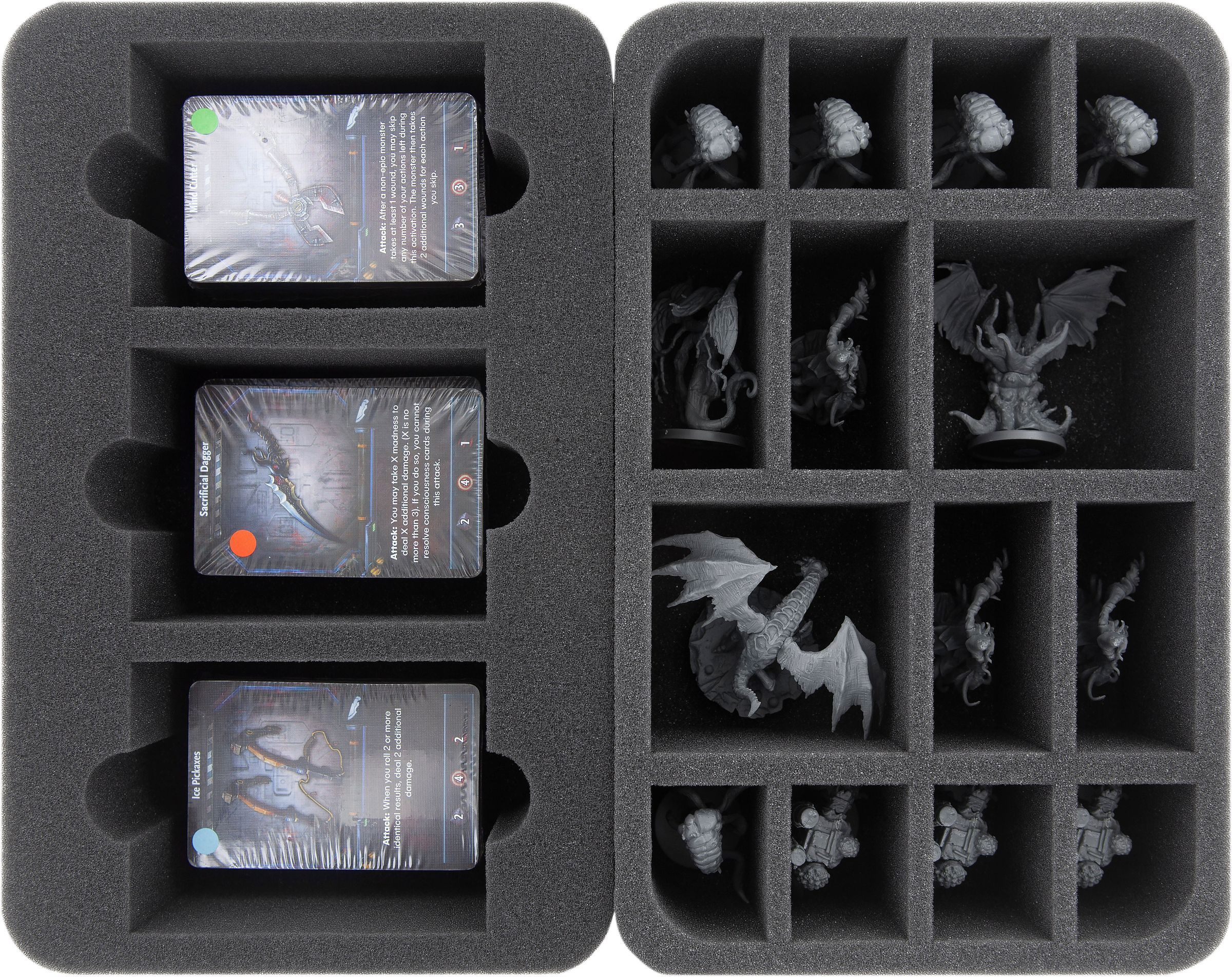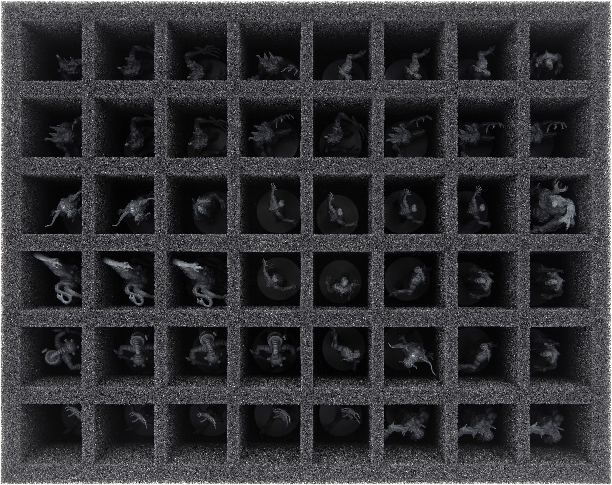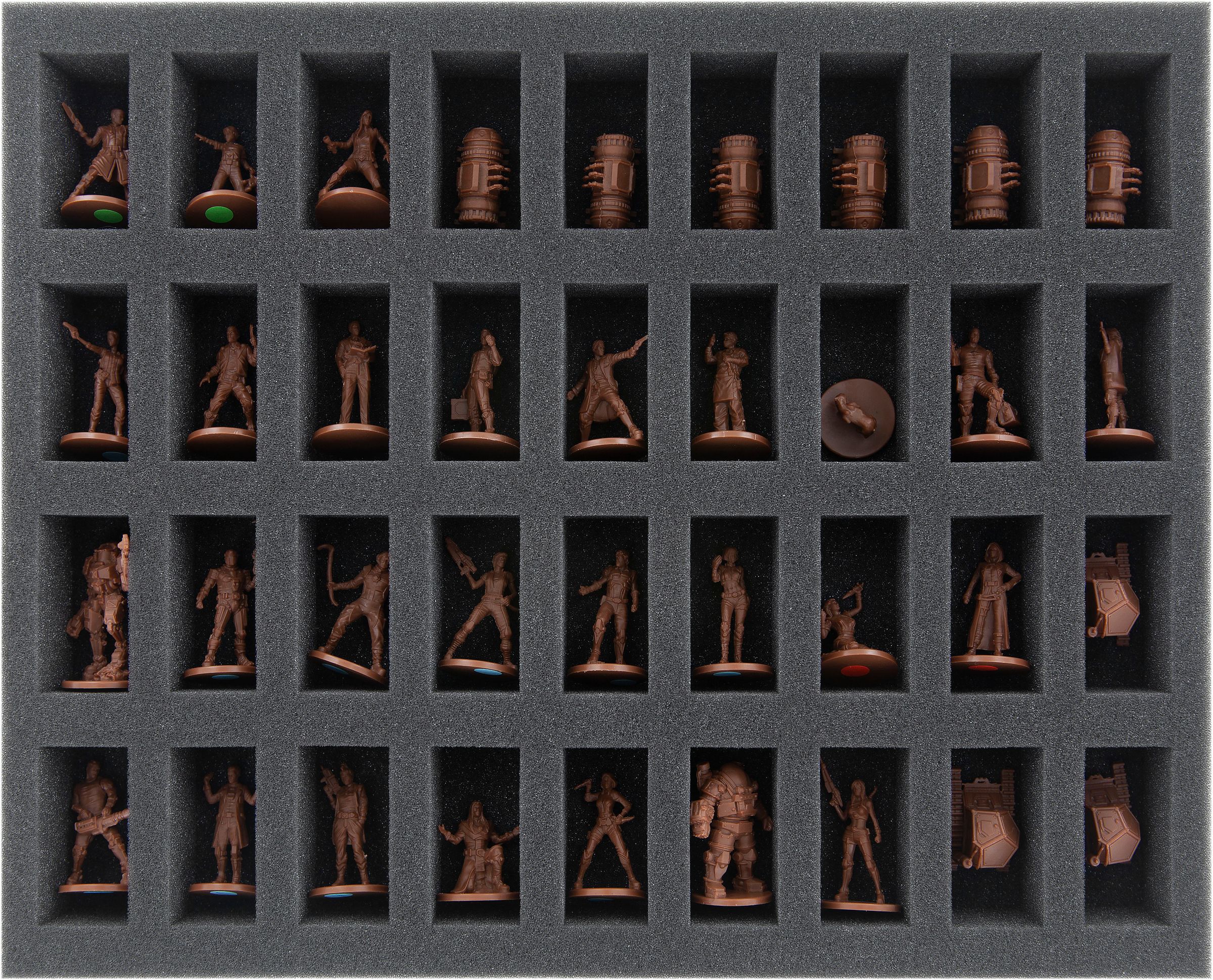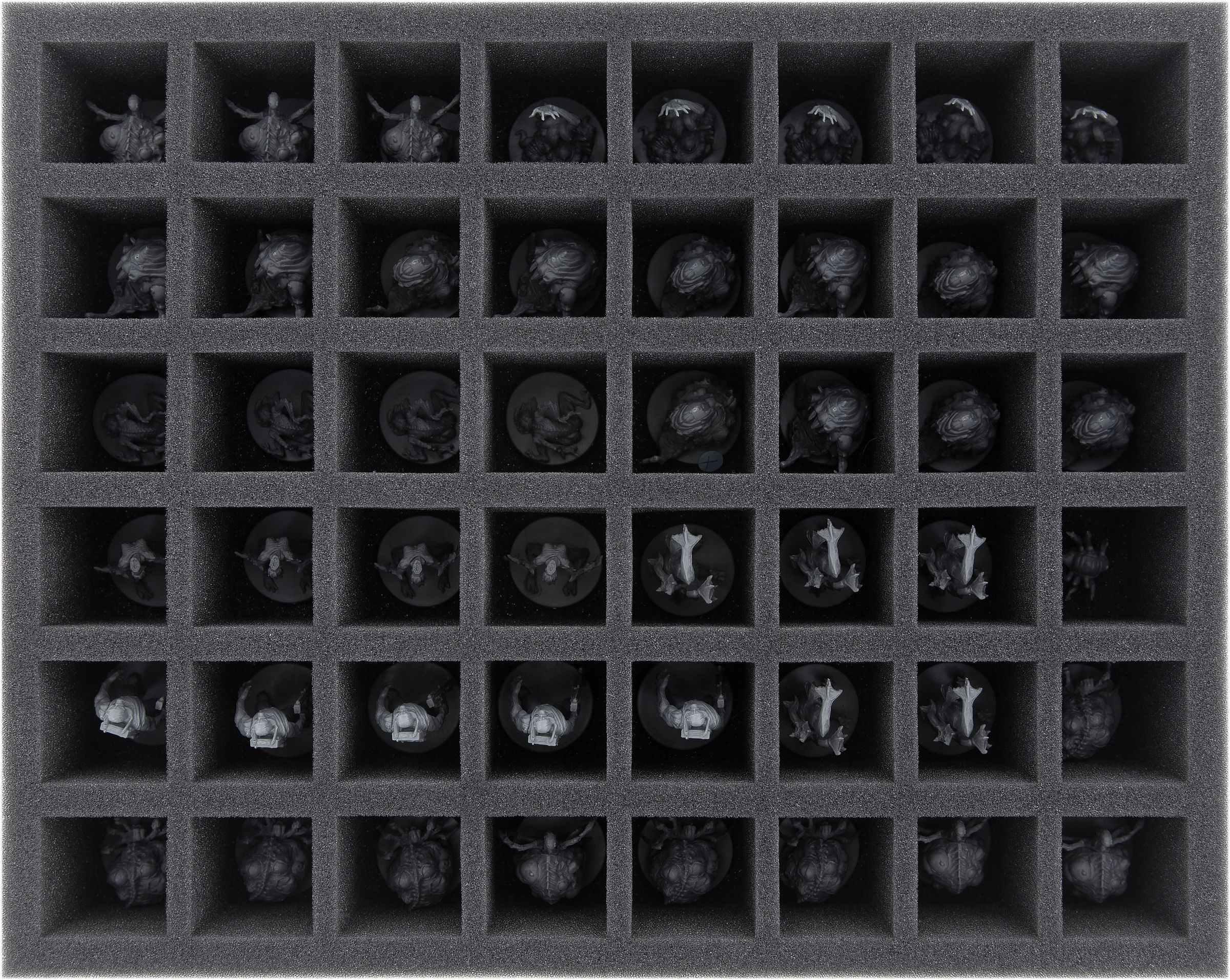 Ya sea Devorador de Mundos, David y Pris o Mutilación - sus miniaturas están seguras en la espuma de poros finos Feldherr. Cada miniatura tiene su propio compartimento que evita que las figuras se deslicen. Si usted pintó sus modelos, puede estar seguro de que el color permanece intacto. Por supuesto, la espuma blanda también protege de forma fiable las piezas delicadas de sufrir daños: Atrocity mantiene su lengua, Unbound sus tentáculos.