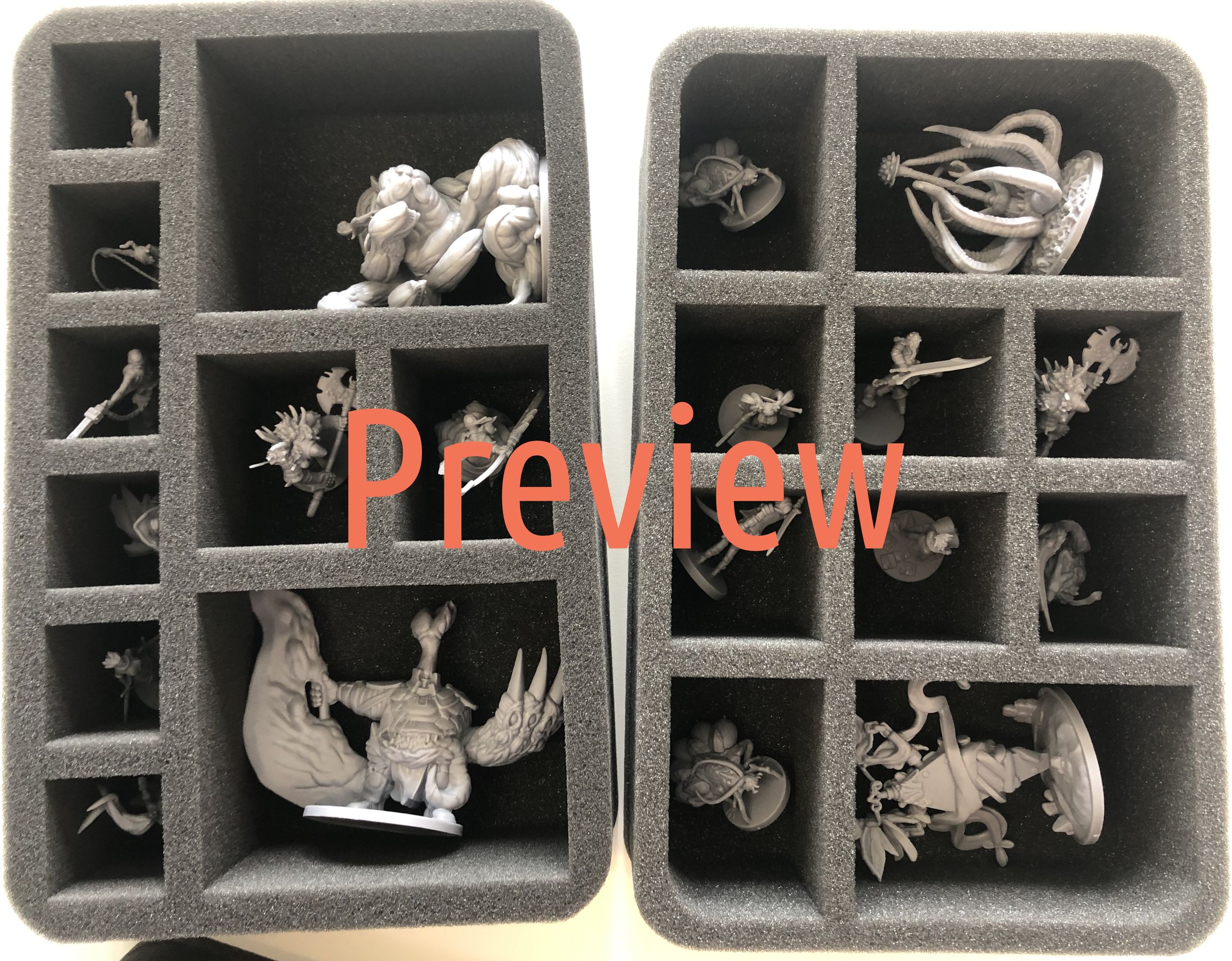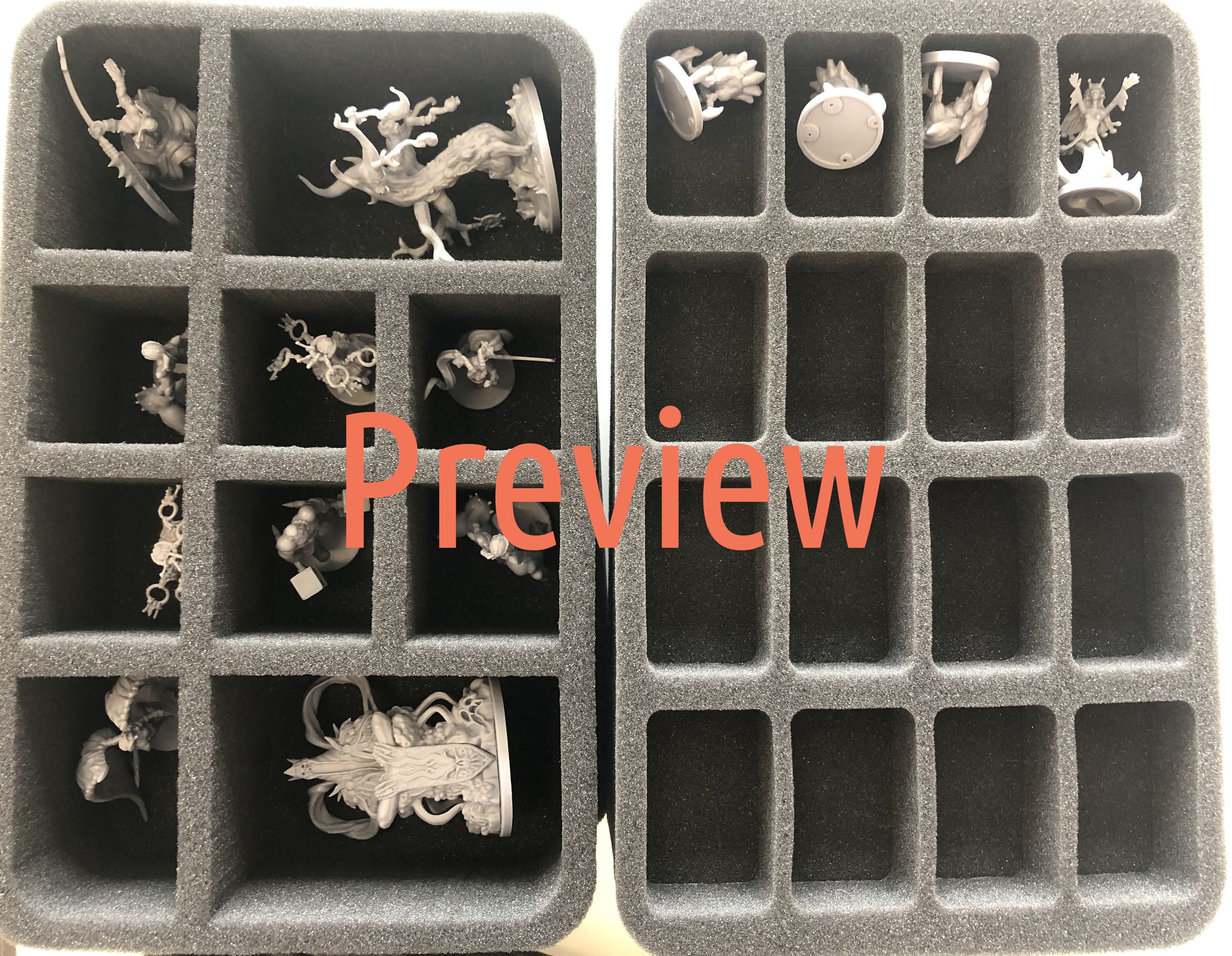 - 2 bandejas de espuma Half-Size con 10 compartimentos cada una para miniaturas de tamaño normal y grande como Rescindo Obsceno, Efigie Grotesca, Señor de las Sombras, Inmortal Torturado, Guardián de la Puerta y las miniaturas del Héroe (HSMFAH070BO)